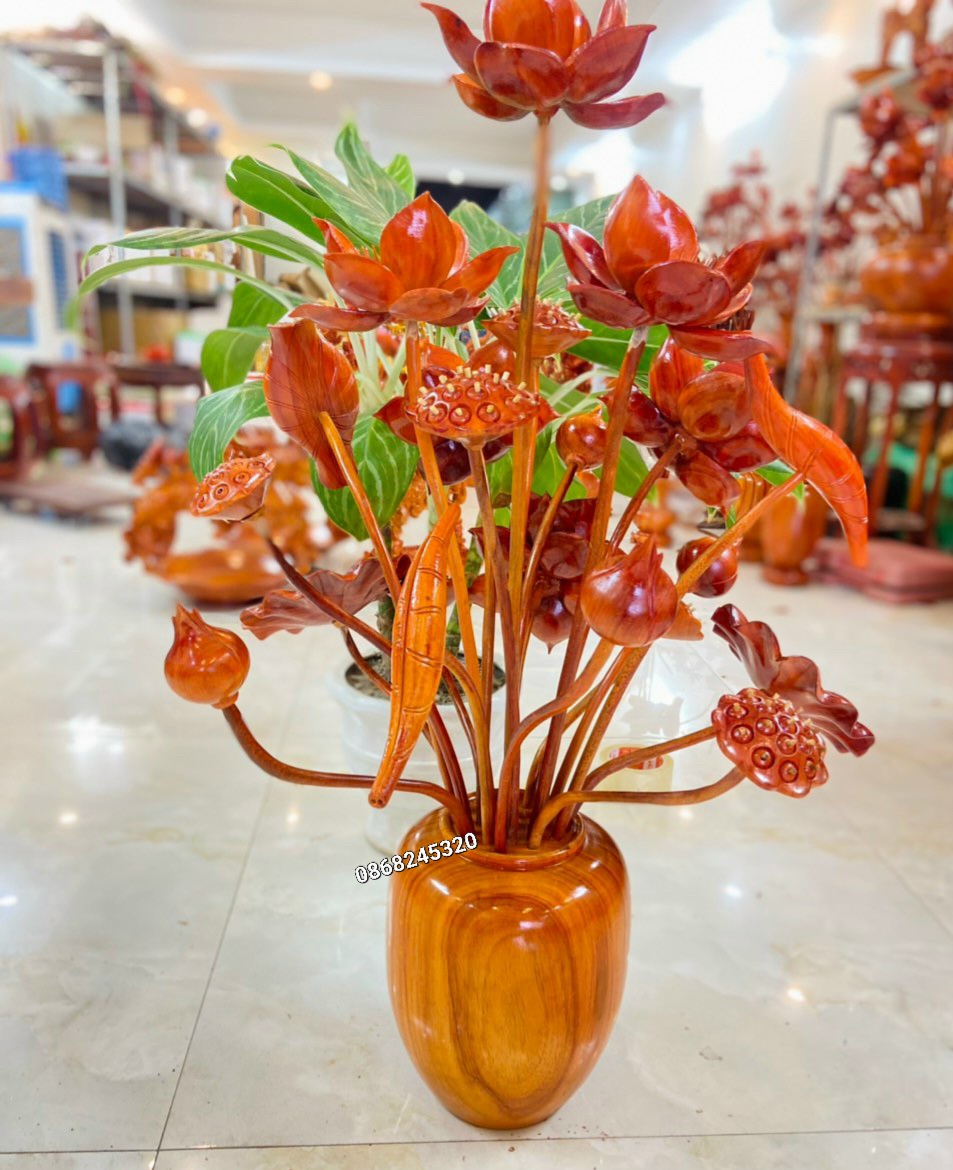 _ 1 bình hoa sen 21 cành trang trí ,phòng khách ,phòng thờ được làm bằng chất liệu gỗ hương đỏ tự nhiên 100% _ Kt bình cắm 23×22cm+ hoa lá gương cao tổng 85cm