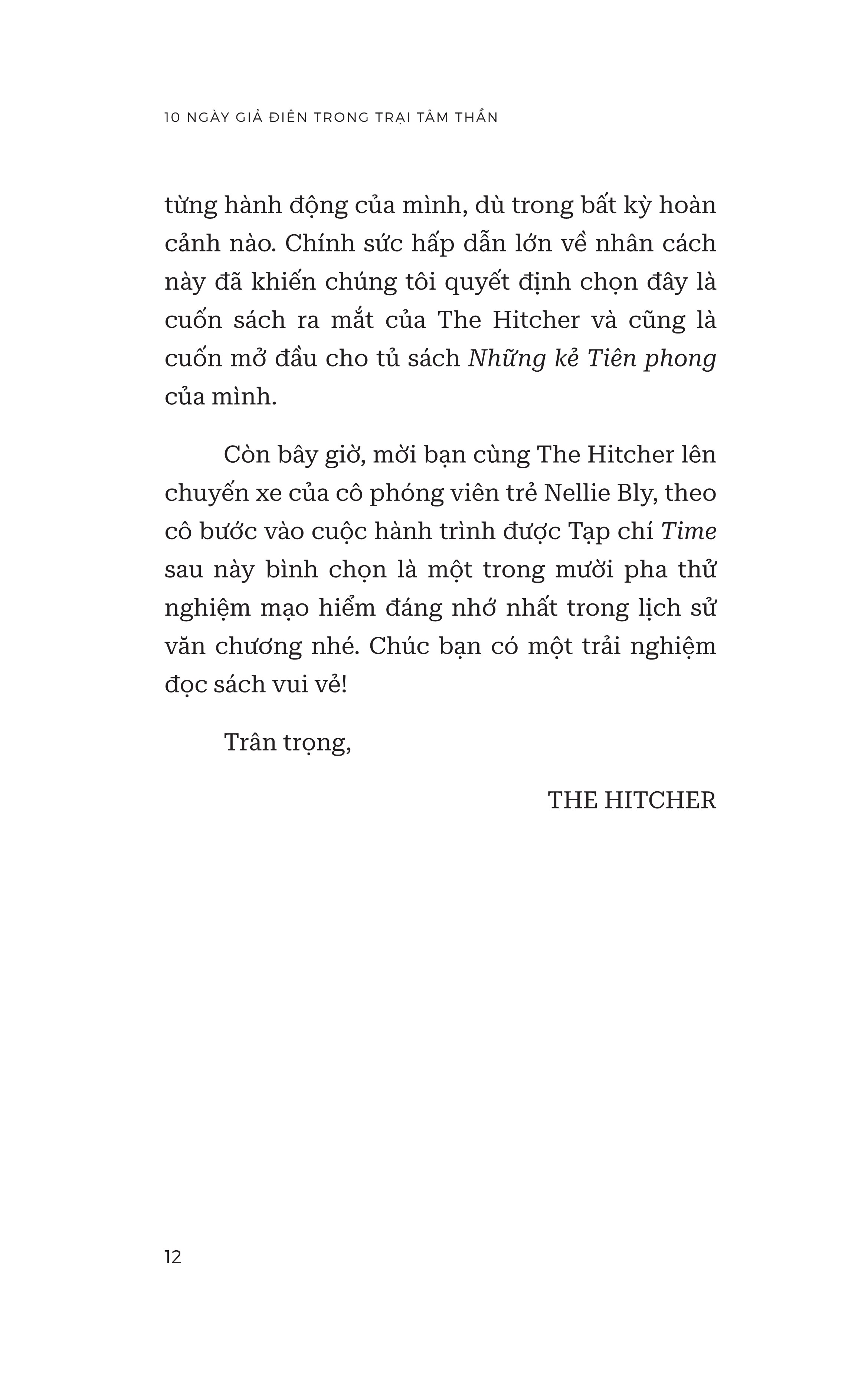 Kỳ thực, ban đầu chúng tôi chỉ định nói thật ngắn gọn về cuốn sách này, nhưng sau khi tìm hiểu kỹ hơn về Nellie Bly, chúng tôi cảm thấy nếu không giới thiệu về toàn bộ cuộc đời kỳ lạ của bà, dù sơ lược, thì thật đáng tiếc. Đối với chúng tôi, Nellie Bly là một người có tinh thần tiên phong và luôn luôn sống thật với những giá trị mà bà theo đuổi, và bà thể hiện điều đó trong từng hành động của mình, dù trong bất kỳ hoàn cảnh nào. Chính sức hấp dẫn lớn về nhân cách này đã khiến chúng tôi quyết định chọn đây là cuốn sách ra mắt của The Hitcher và cũng là cuốn mở đầu cho tủ sách Những kẻ Tiên phong của mình.