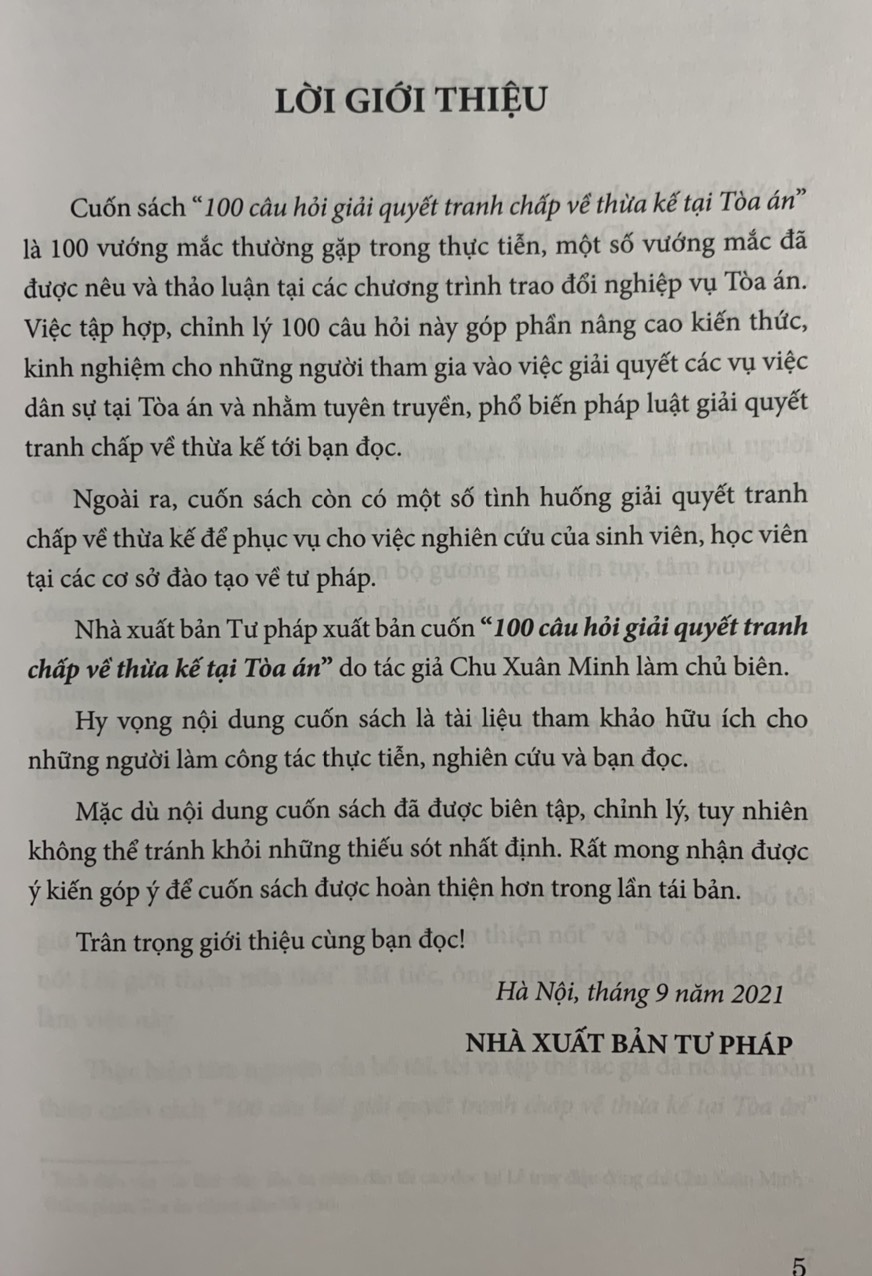 100 câu hỏi giải quyết tranh chấp thừa kế tại tòa Tác giả: Viện kinh tế pháp luật toàn cầu- Chu Xuân Minh (chủ biên) Nhà xuất bản: Tư pháp Công ty phát hành: NXB