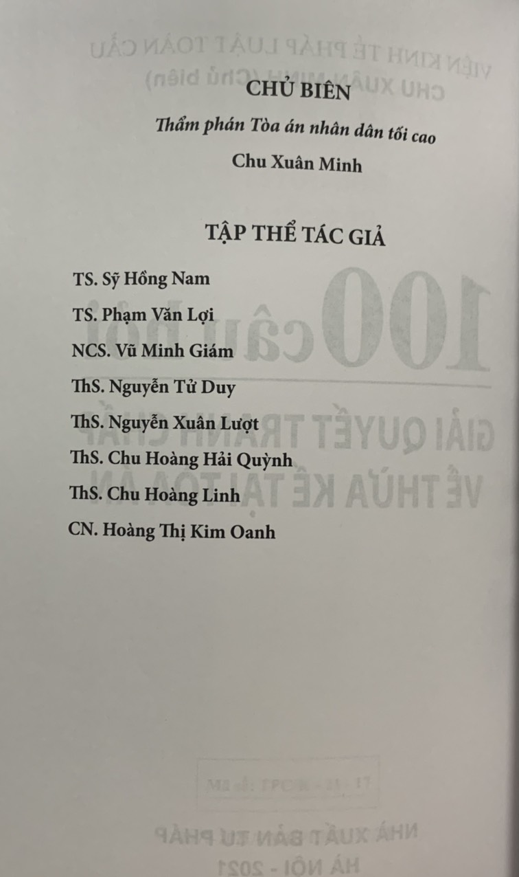 100 câu hỏi giải quyết tranh chấp thừa kế tại tòa Tác giả: Viện kinh tế pháp luật toàn cầu- Chu Xuân Minh (chủ biên) Nhà xuất bản: Tư pháp Công ty phát hành: NXB Tư Pháp Số trang: 284 Xuất bản: 3.2023 Khổ sách: 16*24cm Giá bìa: 160.000 đ   LỜI GIỚI THIỆU: Cuốn sách “100 câu hỏi giải quyết tranh chấp về thừa kế tại Tòa án” là 100 vướng mắc thường gặp trong thực tiễn, một số vướng mắc đã được nêu và thảo luận tại các chương trình trao đổi nghiệp vụ Tòa án. Việc tập hợp, chỉnh lý 100 câu hỏi này góp phần nâng cao kiến thức, | kinh nghiệm cho những người tham gia vào việc giải quyết các vụ việc dân sự tại Tòa án và nhằm tuyên truyền, phổ biến pháp luật giải quyết tranh chấp về thừa kế tới bạn đọc. - Ngoài ra, cuốn sách còn có một số tình huống giải quyết tranh chấp về thừa kế để phục vụ cho việc nghiên cứu của sinh viên, học viên | tại các cơ sở đào tạo về tư pháp. Nhà xuất bản Tư pháp xuất bản cuốn “100 câu hỏi giải quyết tranh | chấp về thừa kế tại Tòa án” do tác giả Chu Xuân Minh làm chủ biên. Hy vọng nội dung cuốn sách là tài liệu tham khảo hữu ích cho những người làm công tác thực tiễn, nghiên cứu và bạn đọc. Mặc dù nội dung cuốn sách đã được biên tập, chỉnh lý, tuy nhiên không thể tránh khỏi những thiếu sót nhất định. Rất mong nhận được ý kiến góp ý để cuốn sách được hoàn thiện hơn trong lần tái bản. Sách Luật VN trân trọng giới thiệu cùng bạn đọc!