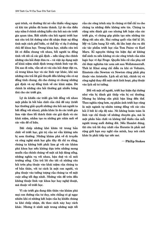Triết học là bộ môn ra đời từ rất lâu, kể từ khi con người có tư duy, biết hỏi về bản chất của cuộc sống, con người và vũ trụ. Triết gia Voltaire từng phát biểu: “Khám phá ra điều gì đúng và thực hành điều gì tốt, đó là hai mục tiêu quan trọng nhất của Triết học”. Bởi thế, bộ môn này ngay từ khi ra đời đã có ảnh hưởng sâu rộng đến con người ở mọi tầng lớp, mọi nghề nghiệp trong xã hội. Bao quát tư tưởng triết học, khoa học, chính trị và tôn giáo trong khoảng thời gian 2.500 năm, 100 Triết Gia Vĩ Đại Thay Đổi Thế Giới là cuốn sách chỉ dẫn tuyệt vời về lịch sử triết học và những tiến bộ con người đã đạt được trong việc giải thích thế giới xung quanh. Hơn thế, với nội dung hấp dẫn, cách truyền tải dễ tiếp cận, cuốn sách sẽ đưa độc giả tiếp cận những quan điểm, tư tưởng của 100 triết gia vĩ đại trong nền triết học phương Tây, có thể kể tới như: Aristotle, Jean-Jacques Rousseau, Karl Marx, Simone de Beauvoir, Noam Chomsky, WVO Quine… Bằng cách trình bày chi tiết về cuộc sống của các nhà triết học cũng như những mối quan tâm và hoàn cảnh sống đã thúc đẩy họ, cuốn sách 100 Triết Gia Vĩ Đại Thay Đổi Thế Giới đã làm cho triết học trở nên sống động hơn, mở ra cách tiếp cận đơn giản, phù hợp và có ý nghĩa để suy nghĩ về thế giới đương đại. Thông tin tác giả: Philip Stokes học triết học tại Đại học Reading, ông đã tốt nghiệp với bằng cử nhân danh dự, sau đó tiếp tục lấy bằng tiến sĩ tại Đại học Bristol. Ông hiện đang giảng dạy triết tại Đại học Bangkok.