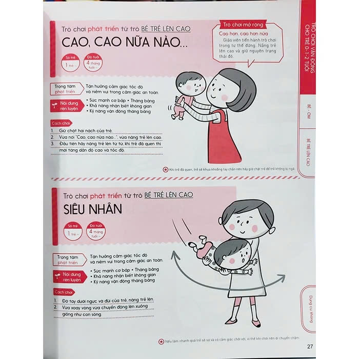 GIỚI THIỆU SÁCH: Trong xã hội hiện đại, trường mẫu giáo và nhà trẻ ngày càng đóng vai trò quan trọng trong việc khắc phục các vấn đề về tình trạng thể lực yếu, cũng như các vấn đề về tinh thần và thể chất của trẻ em. Trong cuốn sách này, chúng tôi phân loại và giới thiệu nhiều trò chơi có thể áp dụng ngay từ thời kỳ sơ sinh, kết hợp dễ dàng với việc chăm sóc trẻ, nhằm giúp trẻ làm quen với việc vận động và các bài tập thể dục. Trước hết hãy cùng xem các trò chơi vận động có thể trở thành những trải nghiệm quan trọng đến thế nào trong việc nuôi dưỡng tương lai của trẻ. 3 ƯU ĐIỂM CỦA CUỐN SÁCH 1. Có nhiều trò chơi đa dạng để trẻ có thể chơi quanh năm. Cuốn sách này giới thiệu rất nhiều trò chơi, từ những trò tương tác mà trẻ 0-1-2 tuổi có thể chơi được đến những trò kết hợp nhiều kỹ năng vận động mà nhiều trẻ có thể cùng tham gia. Trẻ có thể chơi vui vẻ trong suốt cả năm. 2. Có nhiều cấp độ để tăng sự hứng thú và tăng lượng vận động của trẻ. Khi trẻ đã quen với trò chơi cơ bản, hãy thử thách trẻ với những trò chơi phát triển và trò chơi mở rộng! Càng chơi càng vui. Trẻ sẽ say sưa tận hưởng trò chơi và hào hứng chinh phục các thử thách. 3. Dễ theo dõi, dễ thực hành. Với phần giải thích chi tiết và minh họa rõ ràng, cuốn sách sẽ giúp phụ huynh và giáo viên biết cách chơi, tương tác và giao tiếp với trẻ một cách vui vẻ, hiệu quả và an toàn.