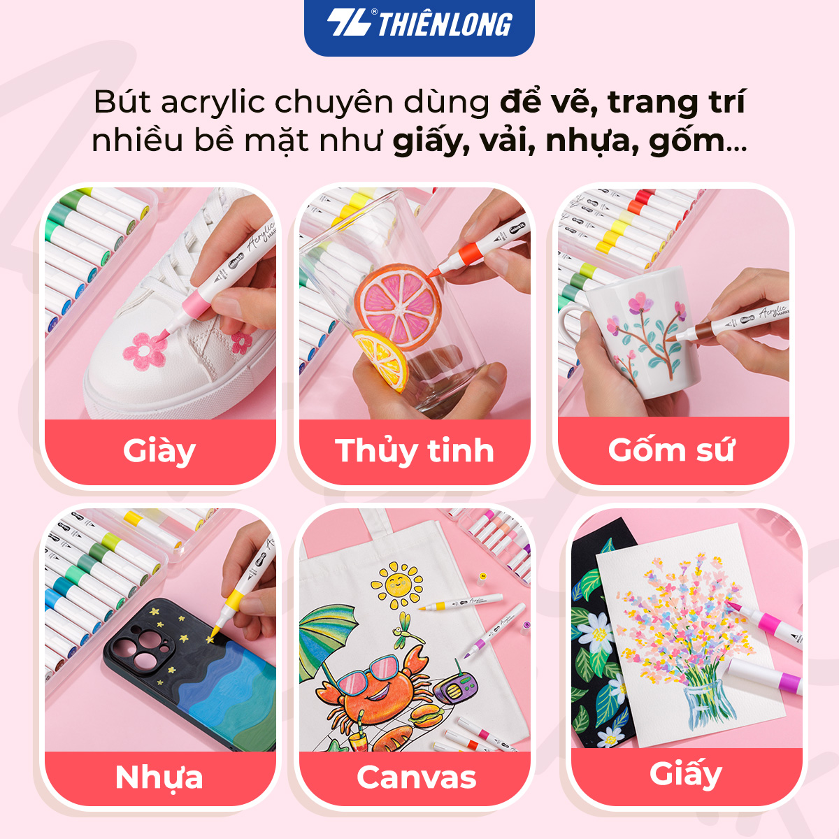 ️ Vẽ được trên các chất liệu: canvas, vải, giấy, gỗ, nhựa, thủy tinh, gốm sứ, kim loại…