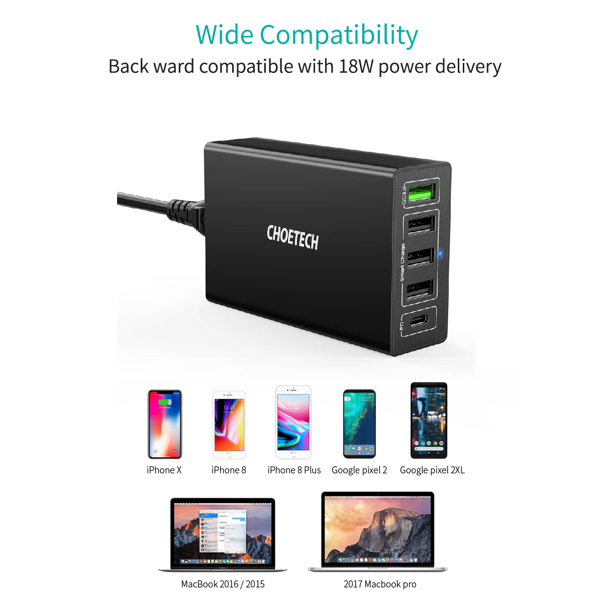 ĐỘ TƯƠNG THÍCH CAO Cóc củ sạc nhanh 60W 4 cổng USB & 1 cổng PD Type-C hiệu CHOETECH Q3-4U2Q phù hợp với hầu hết mọi thiết bị di động, tai nghe, loa, ới công nghệ sạc thông minh chúng sẽ tự động nhận dạng dòng ra phù hợp với thiết bị cắm vào.