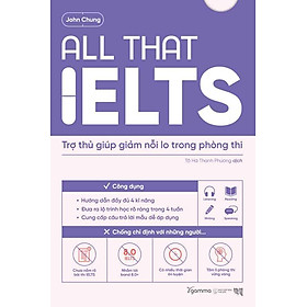 All That IELTS -Trợ Thủ Giúp Giảm Nỗi Lo Trong Phòng Thi đưa ra những phân tích tổng quan về bài thi và các dạng câu hỏi thường gặp, giới thiệu các chiến lược làm bài thực tiễn, các cấu trúc và từ vựng thường gặp. Với các câu trả lời mẫu và mẹo hữu ích khi làm bài, cuốn sách giúp người học cảm thấy tự tin hơn khi bước vào phòng thi. Những bí kíp này không chỉ giúp giảm căng thẳng mà còn là "cứu cánh" cho người học khi gặp khó hoặc bị áp lực thời gian trong quá trình làm bài.