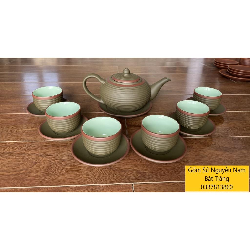 Ấm chén men xanh rêu đậm khắc hoạ tiết sen Gốm sứ Bát Tràng Bọc đồng cao cấp ĐẸP sang trọng và cuốn hút 1 ấm 6 chén 7 đĩa kê giá 1000k Phụ kiện