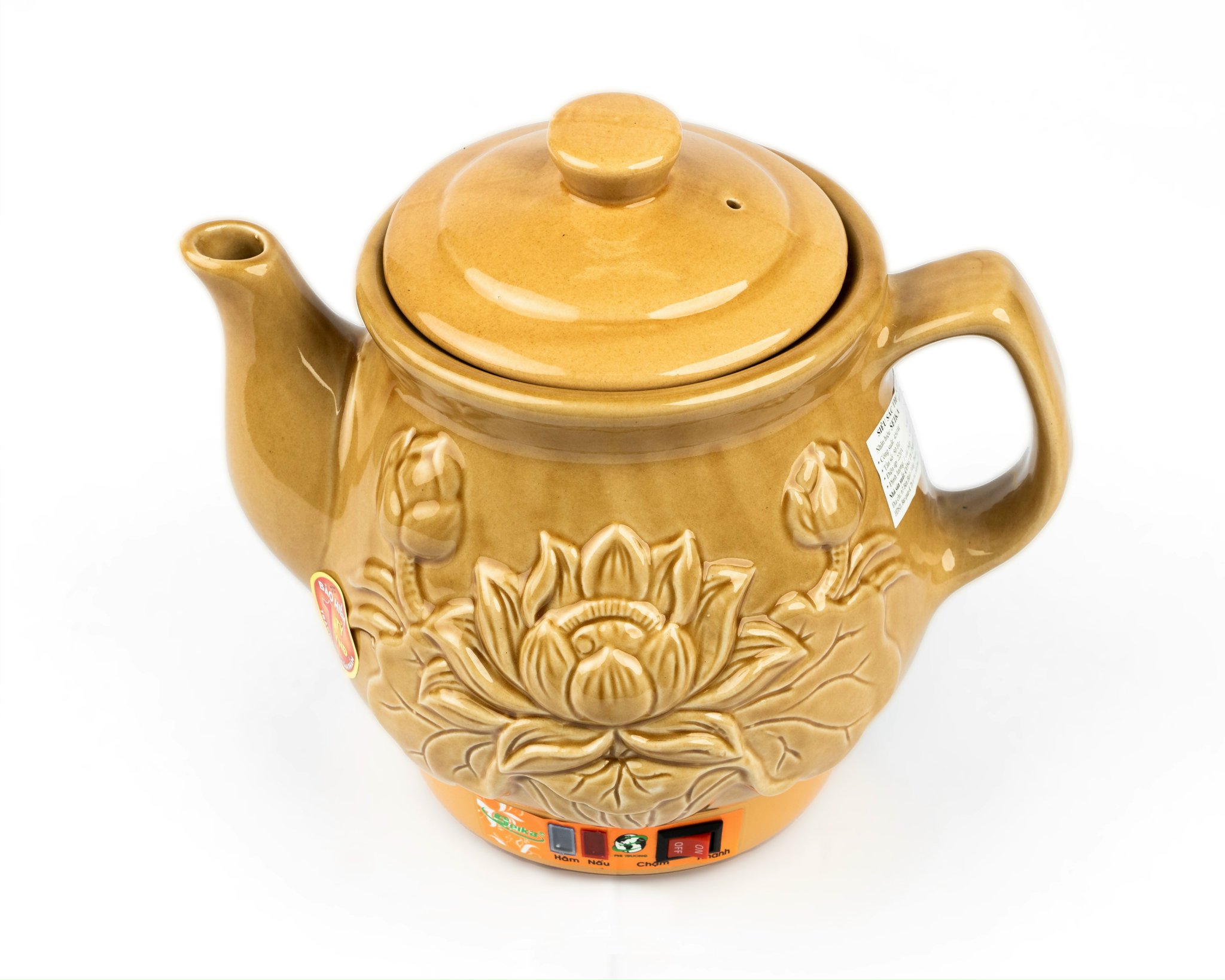 Chế độ sắc tự động; Độ sôi và độ tràn nước đạt tiêu chuẩn; Có chuông báo reo khi nấu xong; Gốm sứ Bát Tràng cao cấp Việt Nam an toàn cho sức khỏe; Mâm nhiệt tráng men Ceramic chống dính cao cấp, an toàn cho sức khỏe; Sản xuất theo Quy chuẩn kỹ thuật quốc gia QCVN 4: 2009/BHCN; Công suất: 450 W Sản xuất tại: Việt Nam; Sản phẩm có màu: Vàng