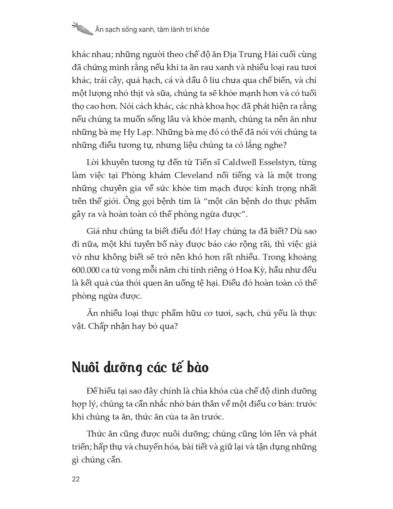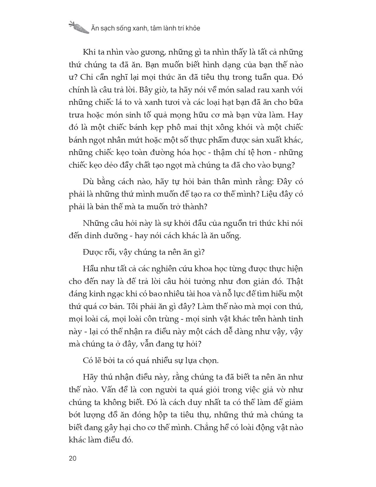 Với cách tiếp cận toàn diện, tổng thể và duy nhất để chăm sóc sức khỏe, Olien sẽ dạy bạn cách khai thác sức mạnh siêu việt của thực phẩm, nước, oxy và cân bằng độ pH để sống cuộc sống tốt nhất của bạn hôm nay, ngày mai và trong tương lai. Dựa trên những hướng dẫn sử dụng “Cách ăn”, danh sách mua sắm, lời khuyên về “những thứ cần vứt bỏ”, hướng dẫn tạo kế hoạch ăn kiêng lành mạnh, cân bằng và lời khuyên về cách sử dụng thực phẩm bổ sung một cách hiệu quả, Ăn sạch sống xanh, tâm lành trí khỏe là một cái nhìn toàn diện về chế độ ăn kiêng và dinh dưỡng, một hướng dẫn thiết yếu giúp chúng ta có một cơ thể khỏe mạnh, tràn đầy sinh lực và hạnh phúc mỗi ngày.