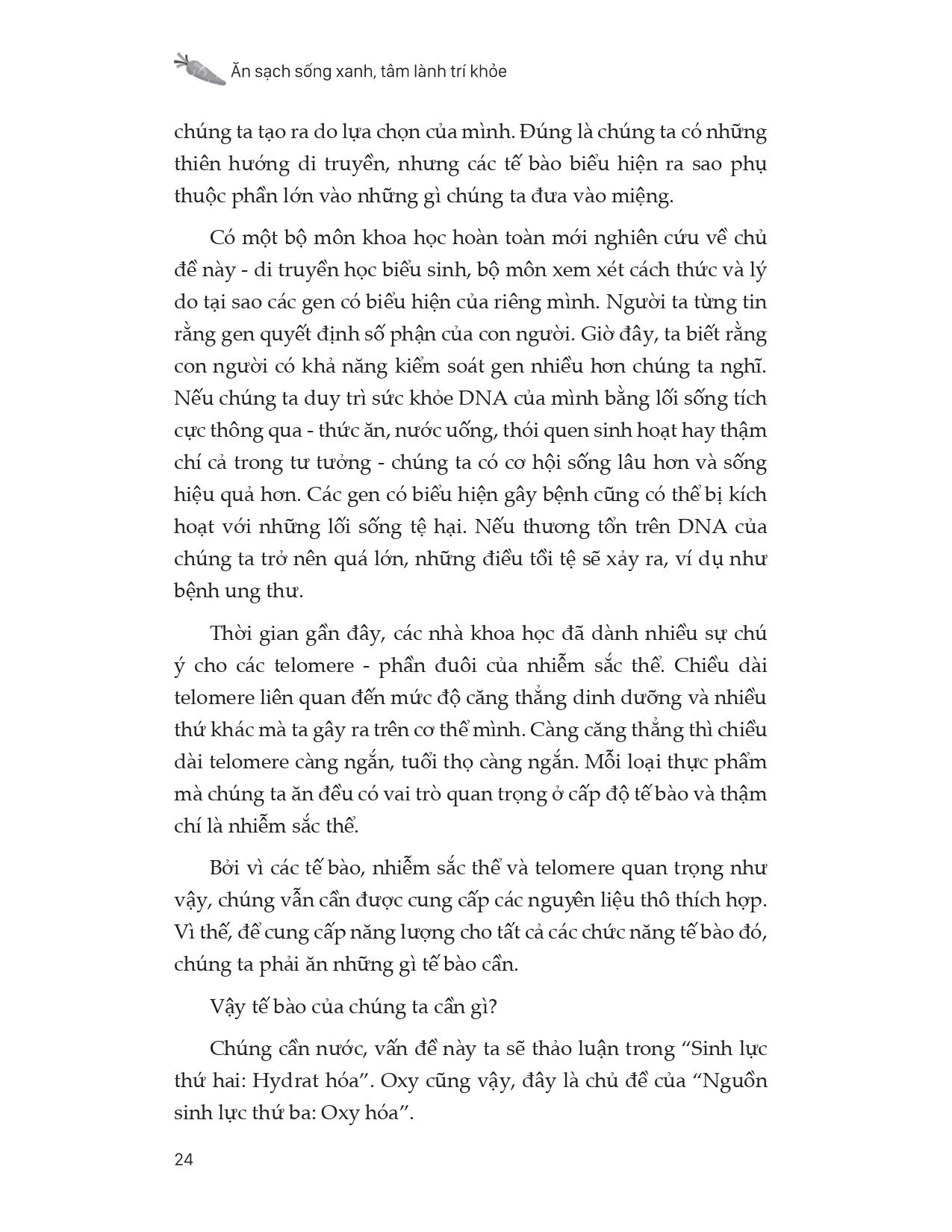 Trong Ăn sạch sống xanh, tâm lành trí khỏe, Darin Olien cung cấp cho chúng ta một cách suy nghĩ hoàn toàn mới về sức khỏe và hạnh phúc bằng cách xác định các động lực sống: Dinh dưỡng chất lượng, Hydrat hóa, Giải độc, Oxy hóa và Kiềm hóa, cho chúng ta biết cách duy trì cân nặng hợp lý, ngăn ngừa ngay cả những căn bệnh nghiêm trọng nhất. Chúng ta luôn được dạy phải xem máu, xương, da, các cơ quan, các nơ-ron thần kinh và tất cả mọi thứ khác một cách riêng rẽ và mỗi bộ phận lại mang đến những vấn đề hay mối lo ngại không giống nhau. Nhưng sự thật là, mỗi một bộ phận nhỏ nhất bên trong cơ thể người, mọi phân tử và tế bào đều phản ứng với năm sinh lực của cuộc sống kể trên. Việc ta cần làm chỉ là làm sao nắm bắt những yêu cầu đó - năm sinh lực của cuộc sống. Và sau đó, ta phải cố gắng hết sức để hoàn thành.