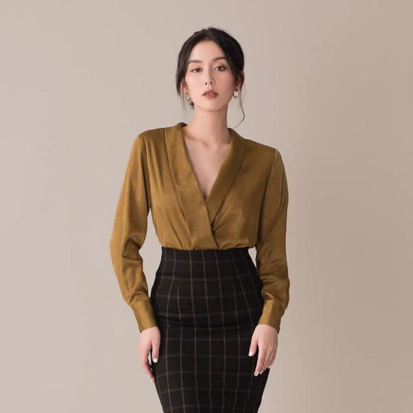 Áo lụa cổ V *Lưu ý: sản phẩm có gửi kèm 01 bộ khuy bấm trong suốt siêu mảnh để khách hàng có thể tuỳ chỉnh độ sâu/ nông của cổ V nên khách có