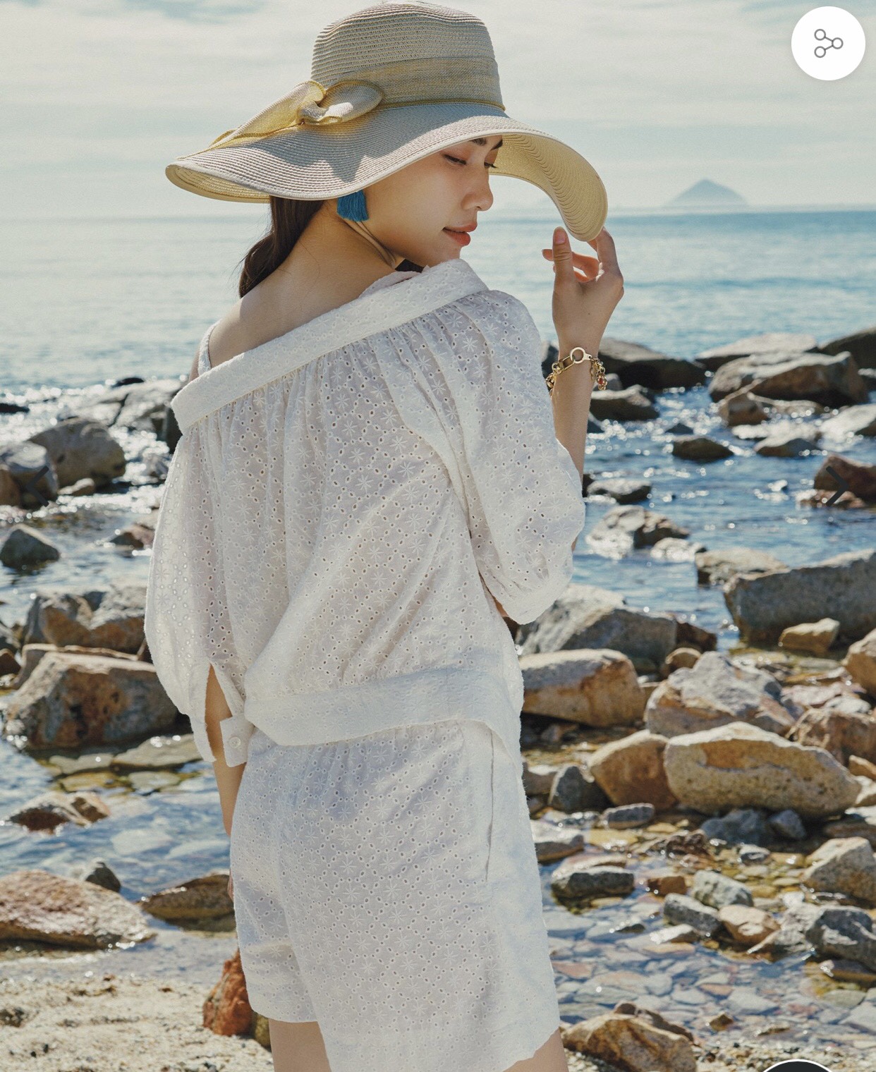 Thiết kế áo trễ vai croptop thắt nơ vai phối chung với quần đồng bộ cotton thêu trắng có thể kết hợp với nhiều phụ kiện khác nhau như sandal, giày cao gót, túi xách,... tạo nên phong cách thời trang đa dạng, phù hợp cho nhiều hoàn cảnh khác nhau.