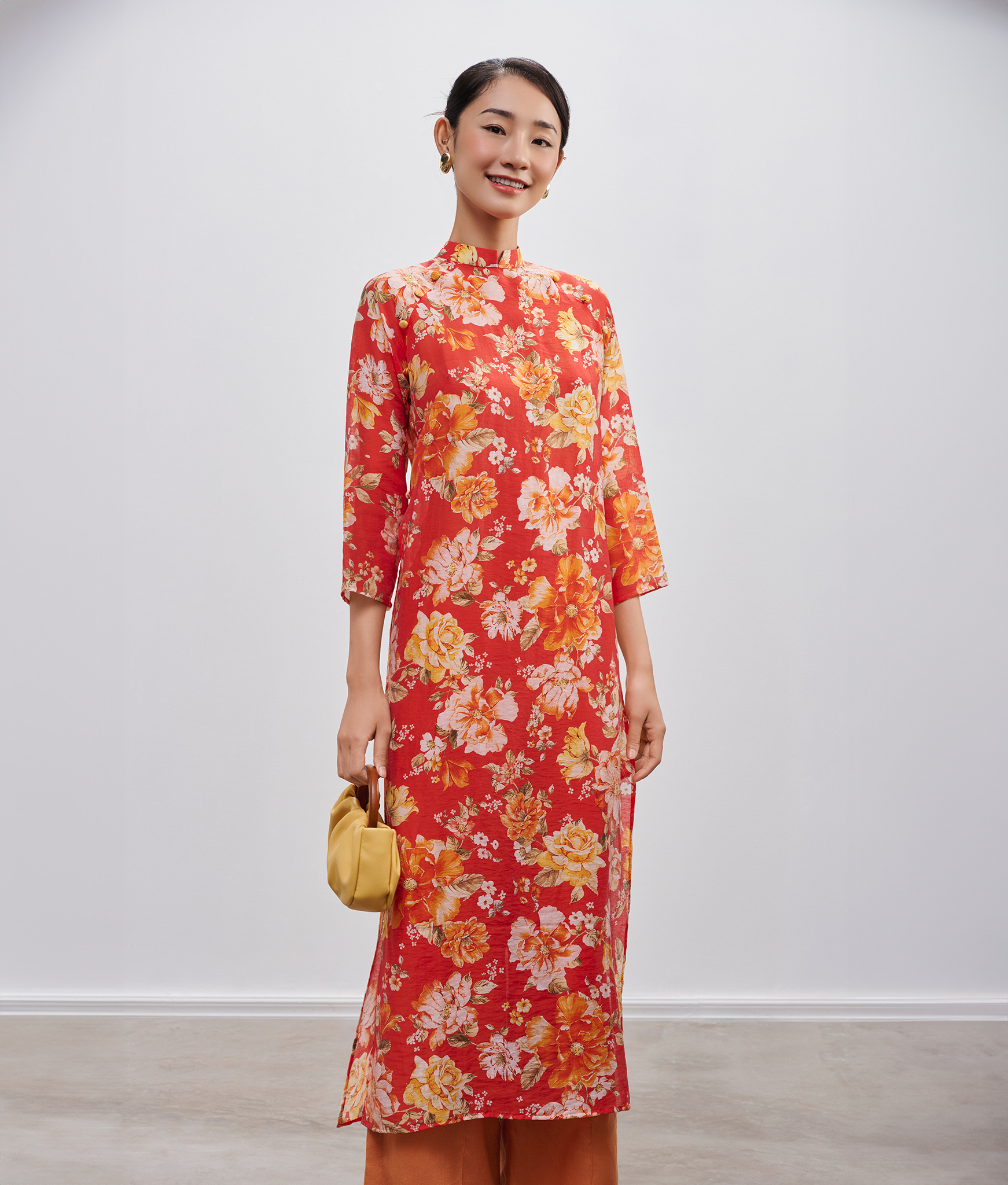 Dáng áo suông nhẹ, không quá ôm sát, vừa đủ để gợi lên những đường cong ý nhị, lại vừa mang đến sự tự do, phóng khoáng. Khi kết hợp cùng quần lụa ống rộng đồng điệu về sắc cam đất, tổng thể bộ trang phục trở nên hài hòa, thời thượng, phá vỡ những quy tắc cũ kỹ để kiến tạo một định nghĩa mới về vẻ đẹp áo dài: thanh lịch, hiện đại nhưng vẫn đậm đà bản sắc.