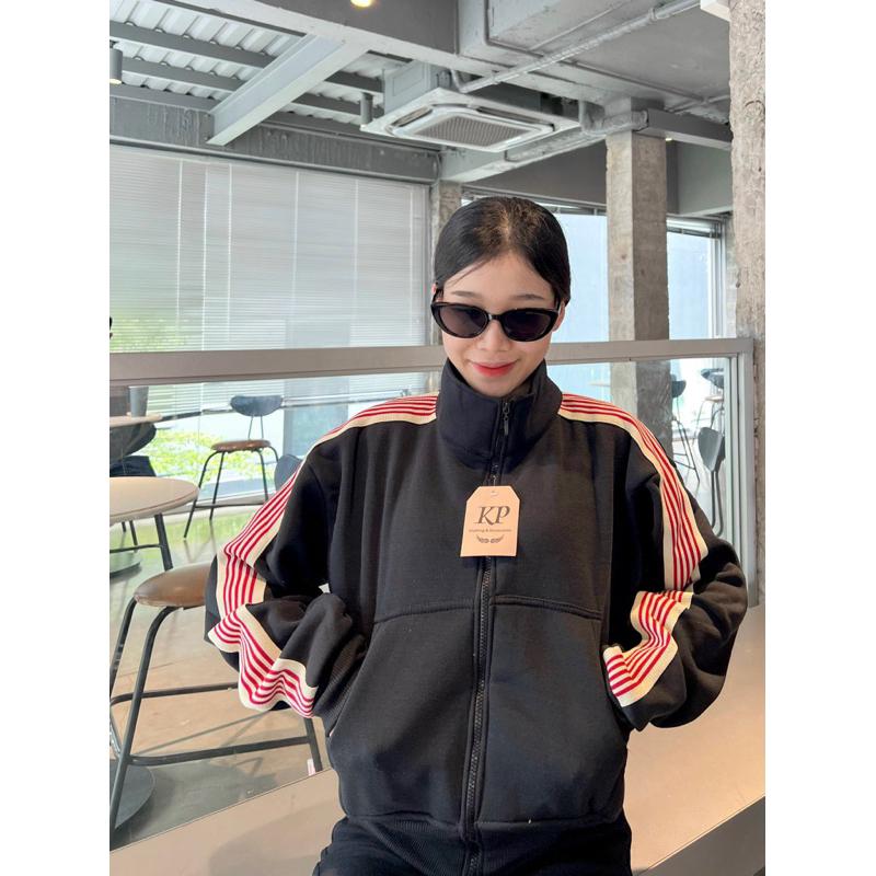 Áo khoác nữ nỉ chống nắng Viền Sọc Cổ Trụ Dáng Lửng là một lựa chọn thời trang cực hót cho các cô gái. Thiết kế cổ trụ và viền sọc tinh tế, sản phẩm