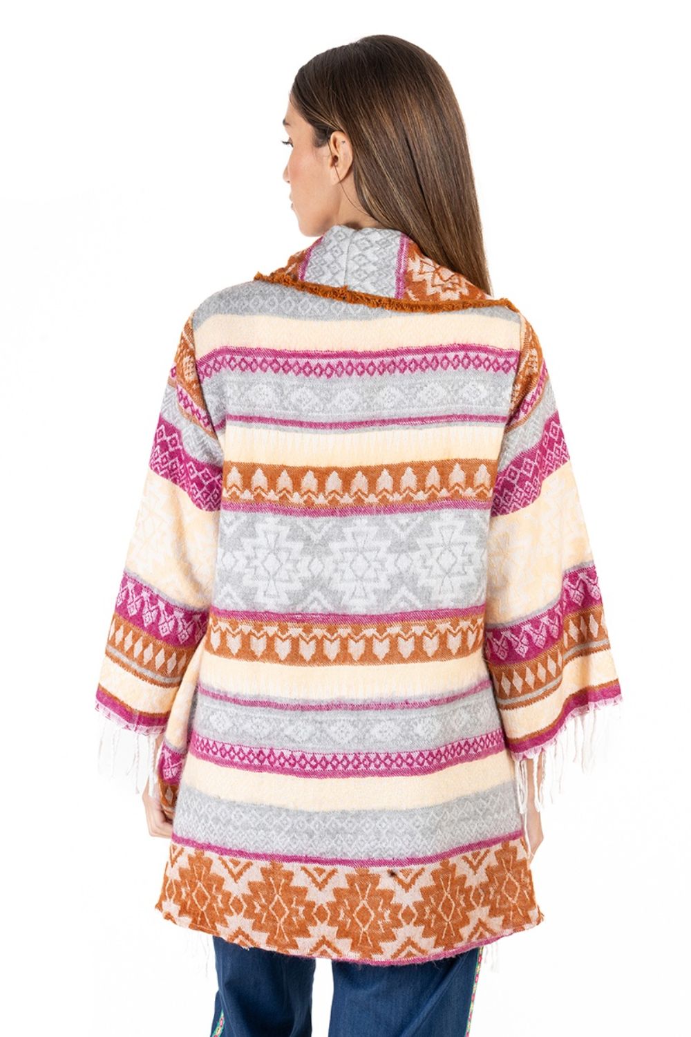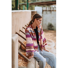 Áo Khoác Isla Bonita, kiểu áo choàng thu đông, không nút cài, họa tiết thổ cẩm độc đáo. Chất vải giống vải bố. Freestyle. Dài áo thân trước 70cm, thân sau 90cm. (50x90cm)Phù hợp đi