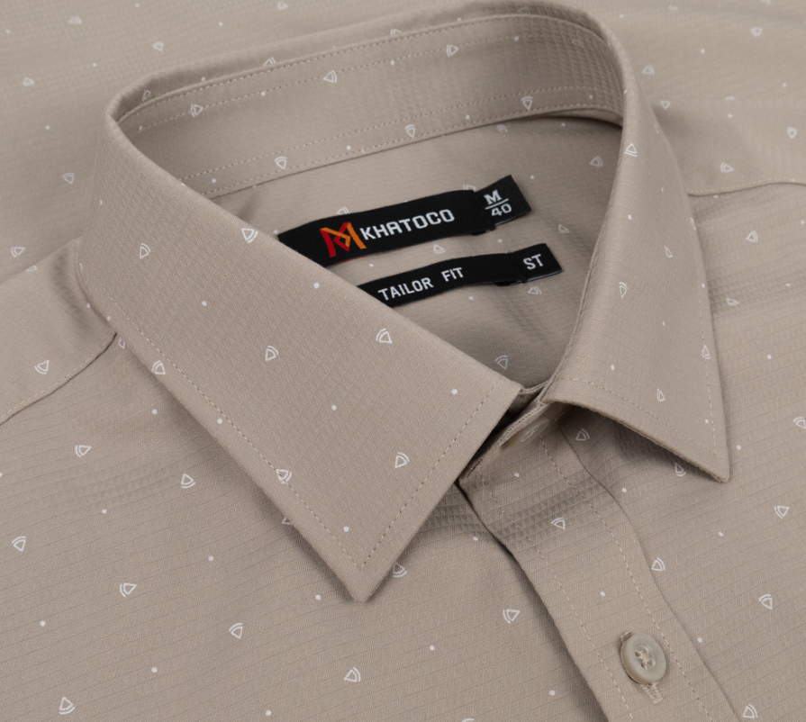 ÁO SƠ MI NAM TAY NGẮN KHATOCO - TAILOR FIT Kiểu dáng: Tailor Fit - Ôm nhẹ, tôn dáng, lịch sự Màu sắc: Be sáng (họa tiết tam giác nhỏ trắng, tinh tế) Size: L – XL – 2XL ️ Thương hiệu: KHATOCO – Hàng Việt Nam chất lượng cao