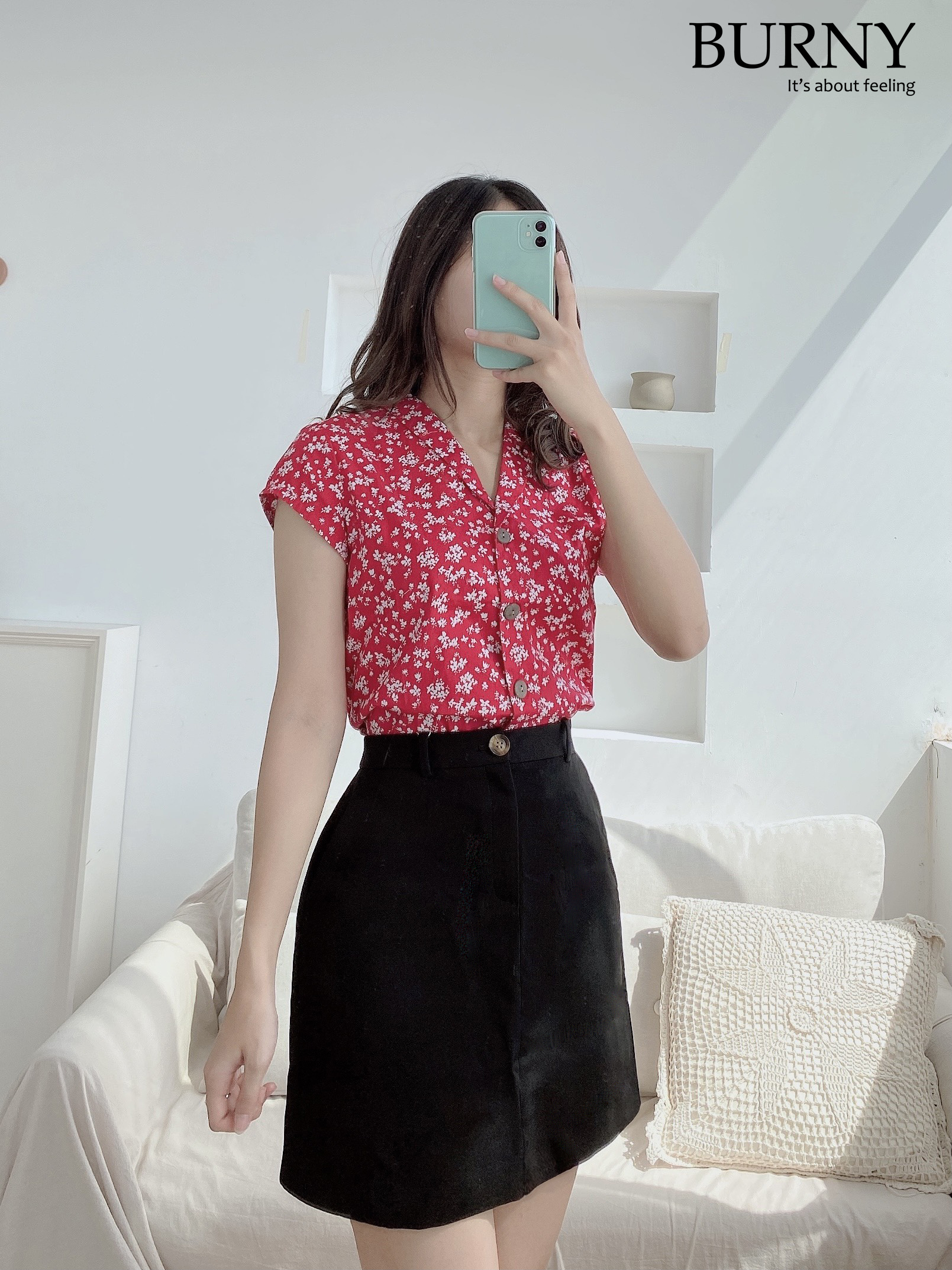 Áo sơ mi nữ tay ngắn hoạ tiết cúc viền xanh xinh xắn