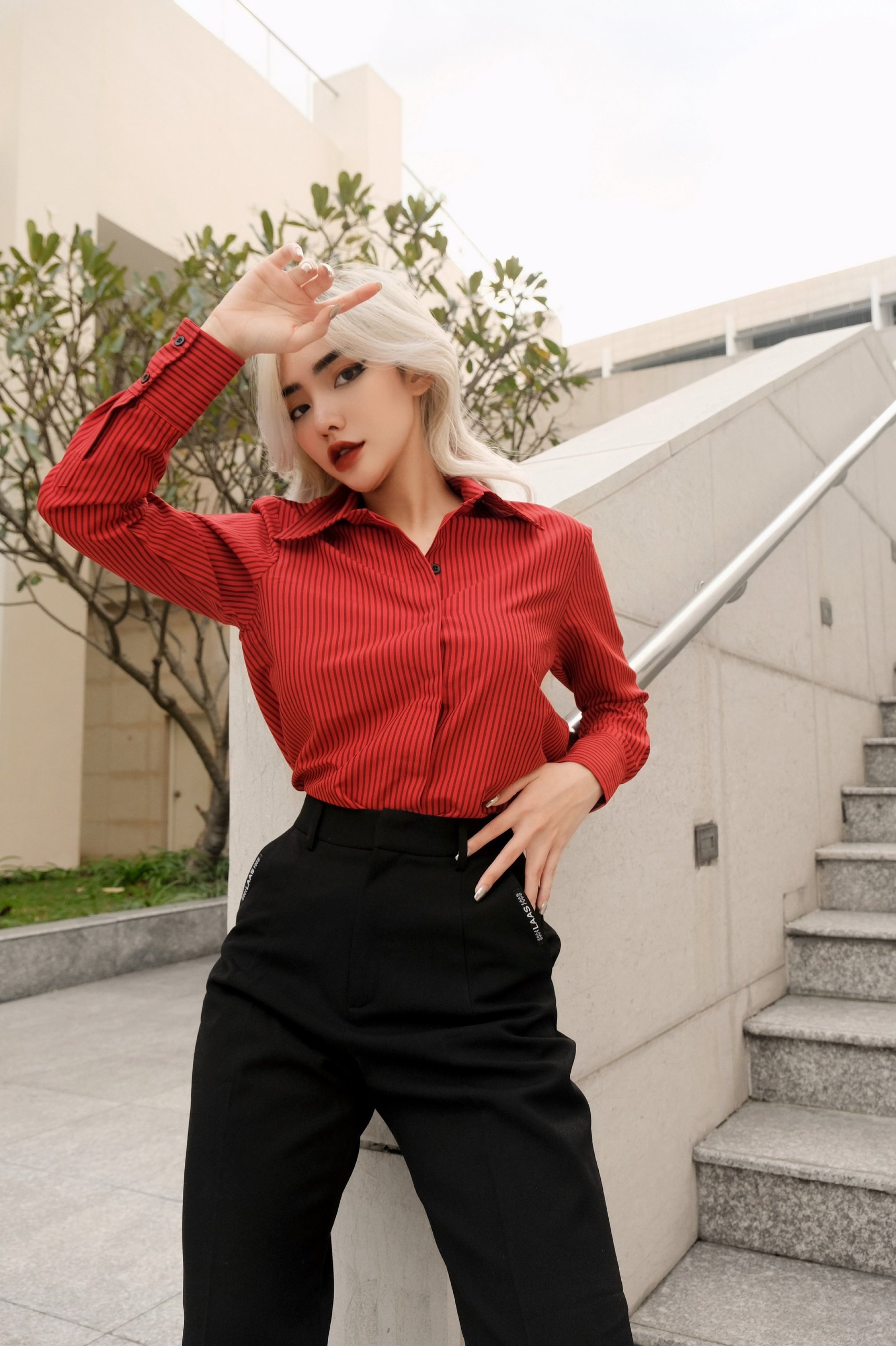 Mua tại TiktokCHẤT SOMI COTTON PHA, ĐỨNG PHOM ÁO MÀU ĐỎ SỌC ĐEN ÁO CỔ SOMI, TAY DÀI, NẸP ÁO GIẤU NÚT PHOM CĂN BẢN SUÔN ĐIỂM NHẤN TAG LOGO NGAY NẸP ÁO