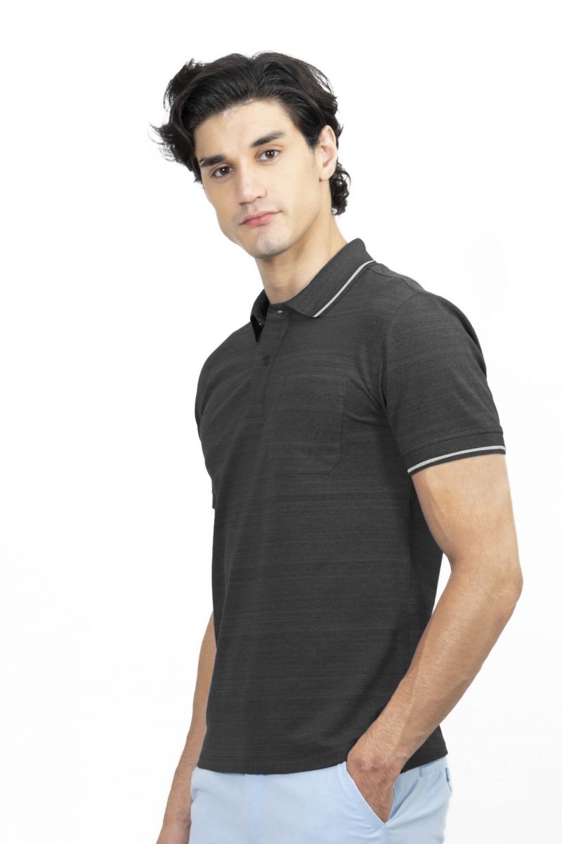 Thành phần 95%CVC 5%Spandex Form Regular fit Mô tả Áo thun Polo melange dệt viền có túi đen NATMMTMCSR210116N Mã sản phẩm NATMMTMCSR210116N