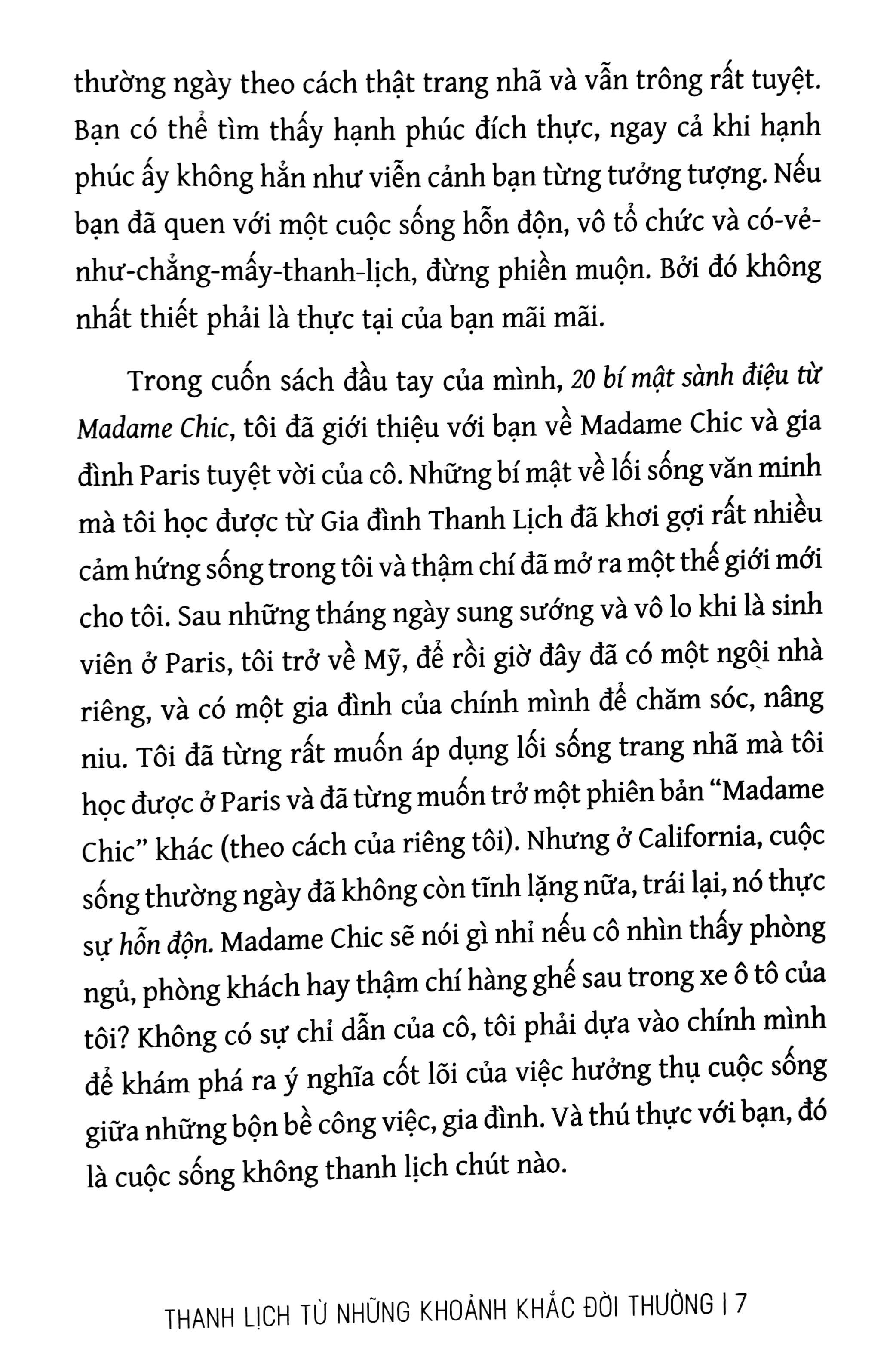 Cuốn sách duyên dàng và hữu ích này ẩn chưa vô số niềm vui mà bạn có thể tìm thấy trong một ngày bình thường; với rất nhiều ý tưởng, playlist, công thức, lịch trình thú vị; giúp bạn tận hưởng những khoảnh khắc đời thường, theo một cách rất Madame Chic. Để cuối cùng, và hơn cả, sự tận hưởng ấy sẽ giúp thay đổi bạn, từ-bên-trong, kiến tạo nên trong bạn phẩm chất je ne sais quoi đầy thanh lịch – phẩm chất mà tất nhiên, khó lòng diễn tả bằng lời, nhưng là đích đến cuối cùng mà những quý cô đích-thực tìm đến.