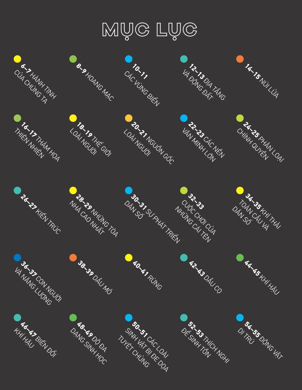 Cuốn sách này bao gồm 50 tấm bản đồ, biểu diễn các số liệu và thông tin độc đáo về hầu như mọi thứ bạn muốn biết về thế giới của chúng ta. Từ những người đoạt giải Nobel đến những loài đang gặp nguy hiểm, những ngọn núi lửa đang hoạt động đến những nền văn minh cổ xưa, nguồn gốc loài người, thế giới tự nhiên, điện ảnh, thể những tấm bản đồ hình họa trong cuốn Atlas vạn vật này mang tới nhiều thông tin lý thú một cách thật hoành tráng và dễ hình dung!