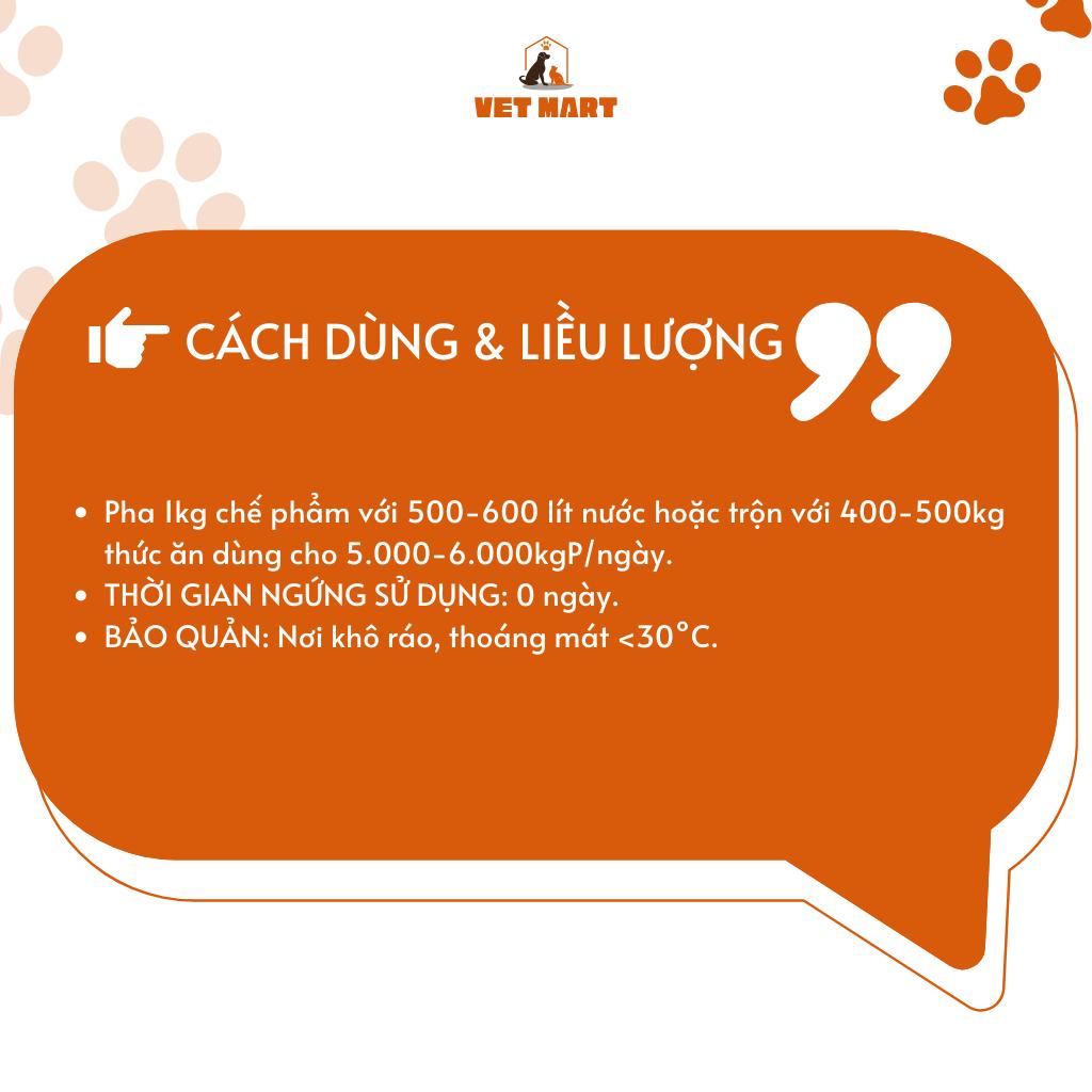 - Dùng kết hợp hỗ trợ trị bệnh nhiễm khuẩn, suy dinh dưỡng, đặc biệt khi chữa bệnh cầu trùng, , phó thương hàn, Gumboro, hội chứng tai xanh (PRRS)… ️CÁCH DÙNG VÀ LIỀU LƯỢNG: Pha 1kg chế phẩm với 500-600 lít nước hoặc trộn với 400-500kg thức ăn dùng cho 5.000-6.000kgP/ngày. THỜI GIAN NGỨNG SỬ DỤNG: 0 ngày. BẢO QUẢN: Nơi khô ráo, thoáng mát <30°C. ️CHÍNH SÁCH ĐỔI TRẢ VET MART xin phép hỗ trợ khách hàng đổi trả sản phẩm trong trường hợp: Bước 1: Cung cấp clip & hình chụp tất cả sản phẩm khách nhận được, và nhắn tin cho shop Bước 2: Shop sẽ hỗ trợ gửi lại hàng cho khách nếu THIẾU sản phẩm. Và shop sẽ hỗ trợ đổi trả sản phẩm 1-1 nếu gửi SAI MẪU, sản phẩm lỗi do phía nhà sản xuất Tất cả chi phí phát sinh, shop sẽ chịu Lưu ý: