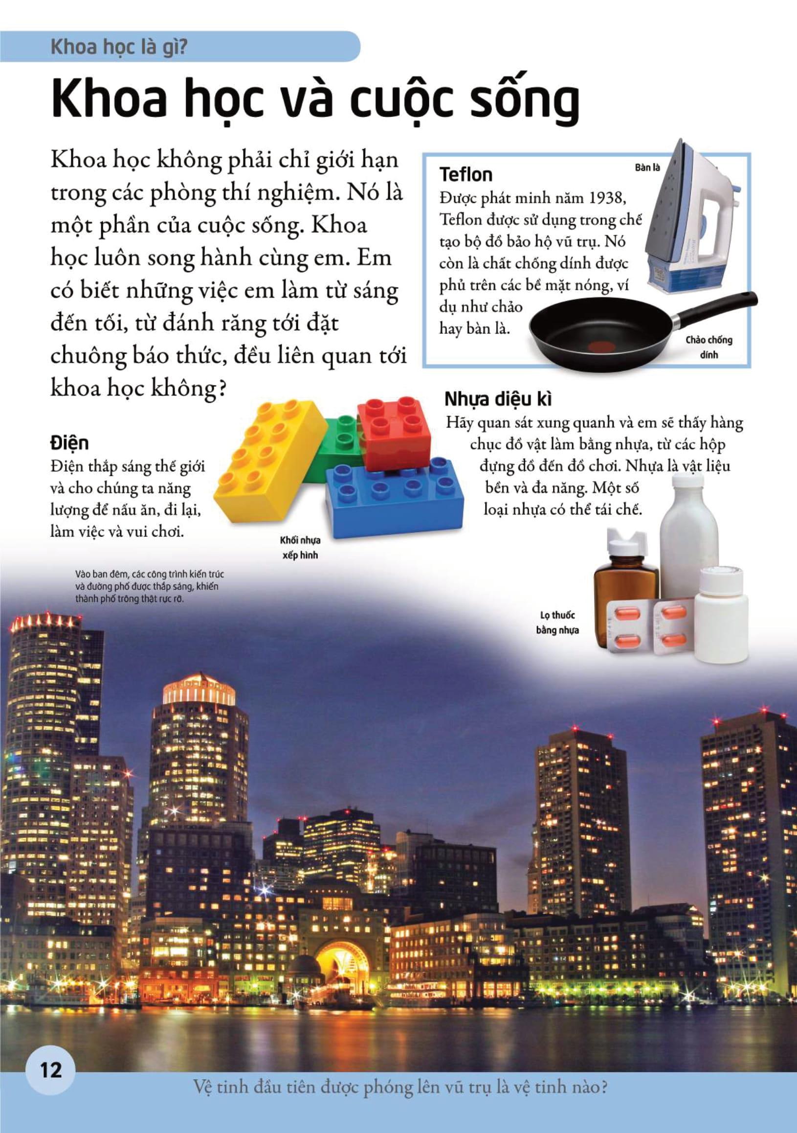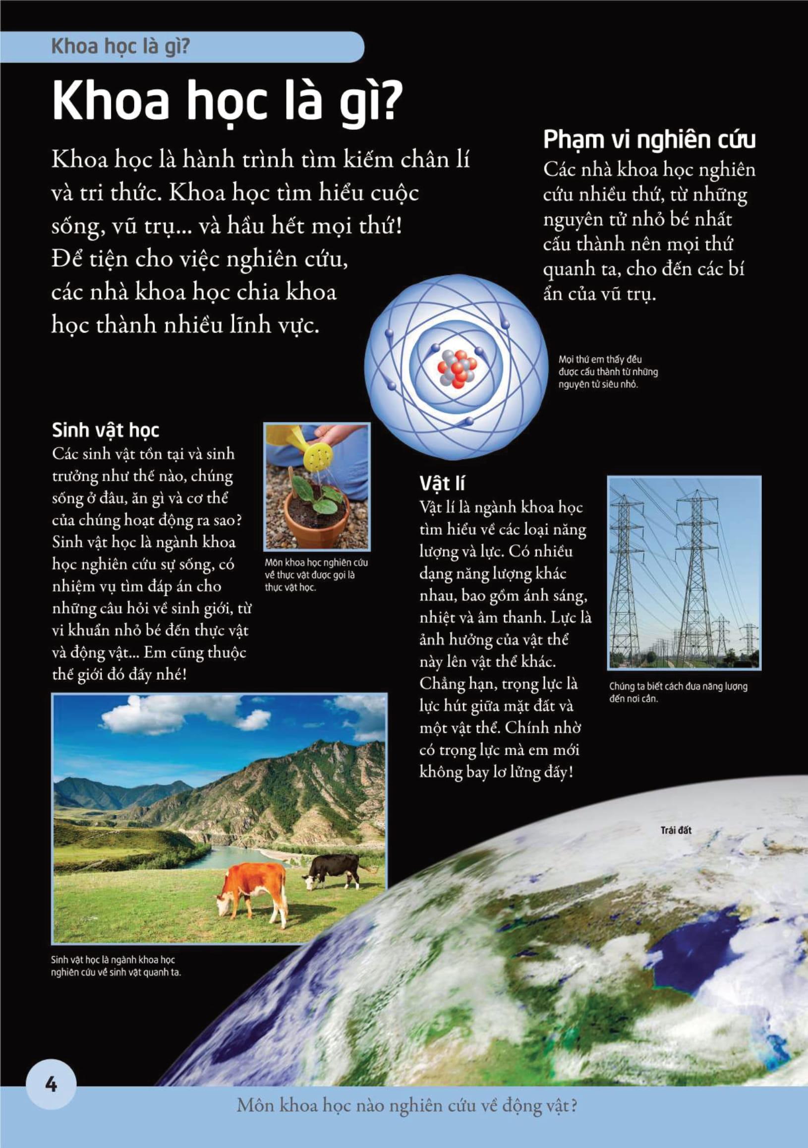 Với các hình minh họa trực quan sinh động, bắt mắt, cuốn sách cung cấp một lượng kiến thức phong phú, súc tích, dễ hiểu, cùng những câu hỏi vui, mẩu thông tin thú vị về khoa học. Em sẽ được tìm hiểu từng lĩnh vực mà khoa học nghiên cứu, từ sinh vật học, hóa học, vật lí tới thiên văn học. Bên cạnh đó, em có thể tìm trong cuốn sách các hướng dẫn và gợi ý giúp em thử làm nhà khoa học nhí nữa đấy.