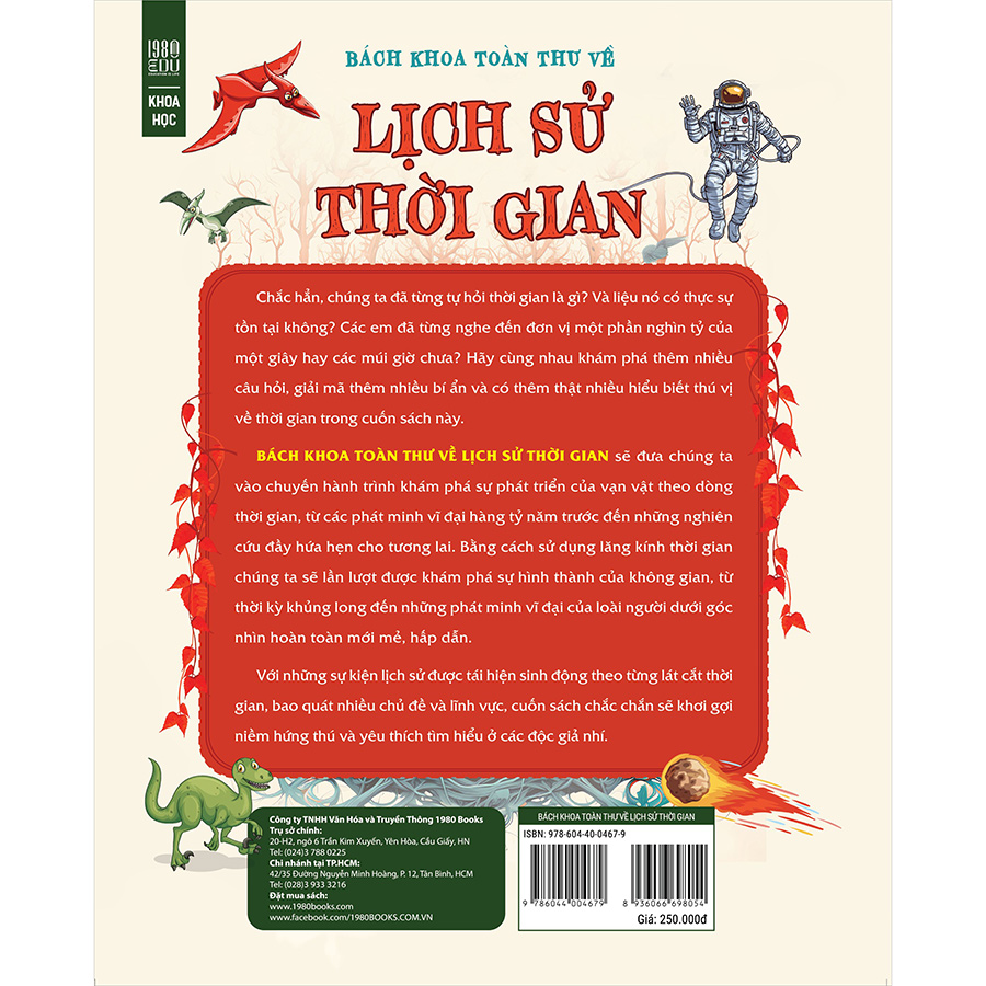 Trong cuốn sách “Bách khoa toàn thư về Lịch sử thời gian” đưa chúng ta vào chuyến hành trình khám phá sự phát triển của vạn vật theo dòng thời gian, từ các phát minh vĩ đại hàng tỷ năm trước đến những nghiên cứu đầy hứa hẹn cho hàng chục năm sau. Cuốn sách sử dụng lăng kính thời gian để soi chiếu nhiều chủ đề STEAM mà chúng ta yêu thích, như không gian, khủng long, động vật, cơ thể con người hay máy móc, với một góc nhìn hoàn toàn mới mẻ.