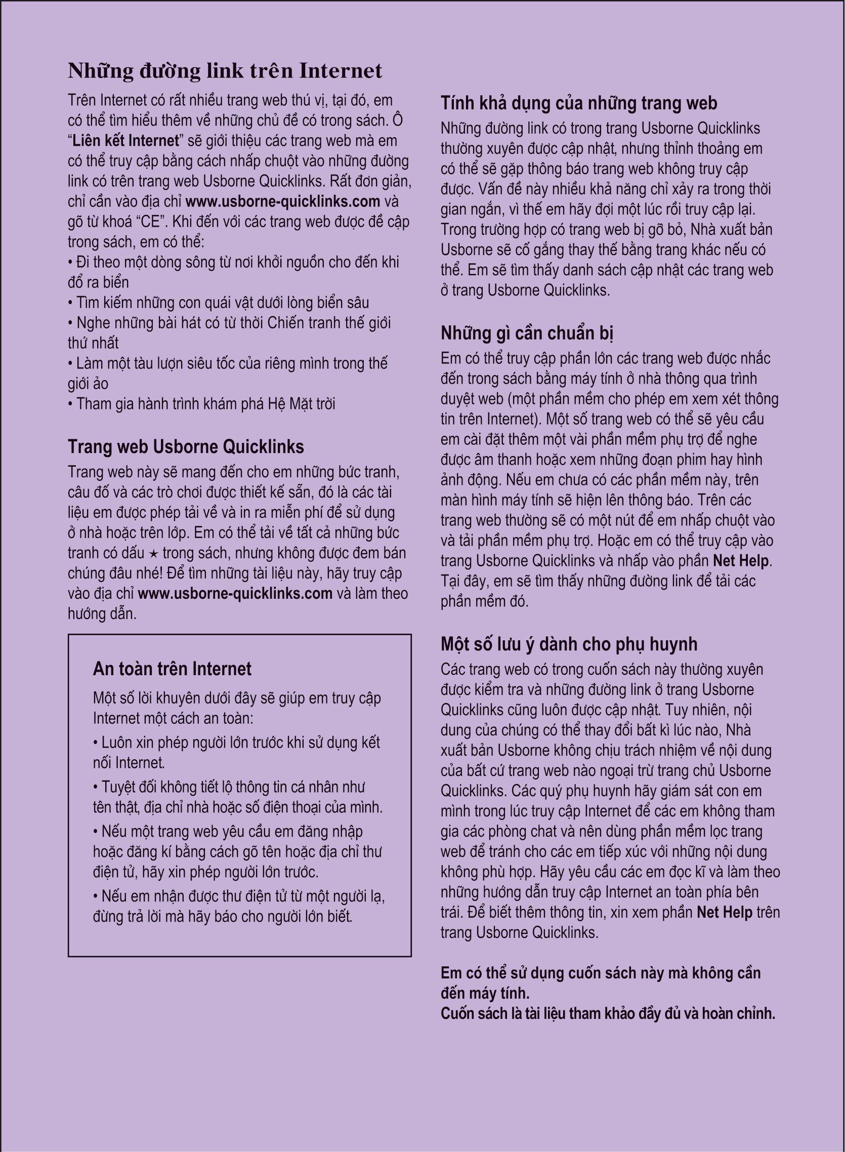 - Liên kết Internet: cuốn sách đặc biệt còn giới thiệu những trang web chứa đựng nhiều thông tin, trò chơi và hoạt động thú vị giúp các em nắm vững các kiến thức vừa học được và cập nhật thêm tin tức mới nhất về các thành tựu khoa học kỹ thuật hiện đại. Bách Khoa Tri Thức Dành Cho Trẻ Em sẽ kích thích sự ham hiểu biết và bồi đắp thêm niềm đam mê khám phá trong bé.
