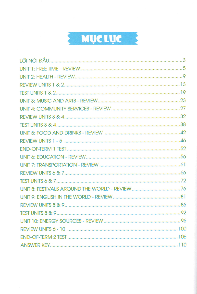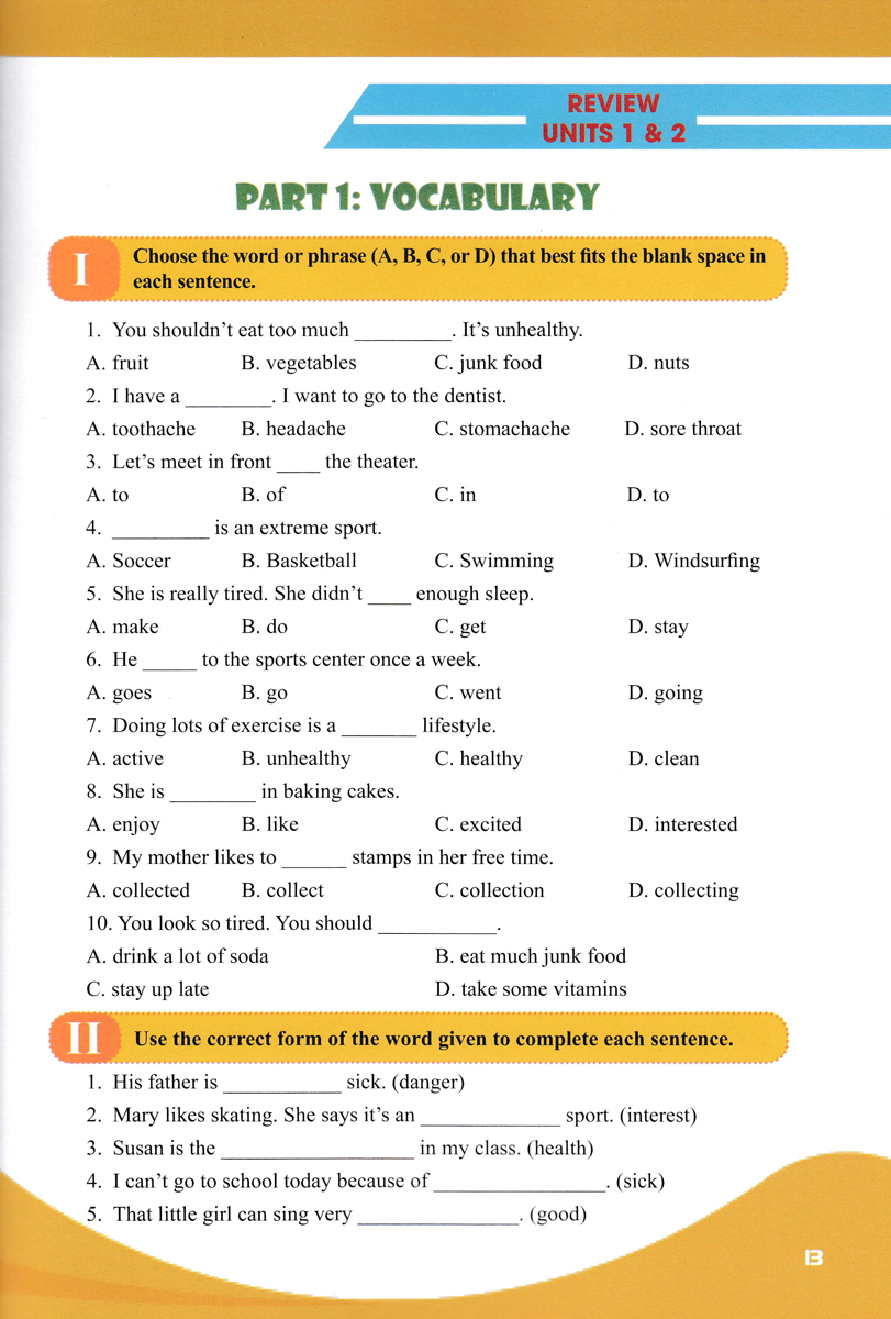 Phần 1: Unit Review and Tests (Các đề ôn tập và bài kiểm tra). Các đề ôn tập trong phần này sẽ được trình bày dưới dạng các bài luyện tập theo từng unit (Unit Review). Sau mỗi 2 hoặc 4 unit sẽ có một bài kiểm tra (Test) tương ứng với từng học kì để học sinh có thể tự kiểm tra .