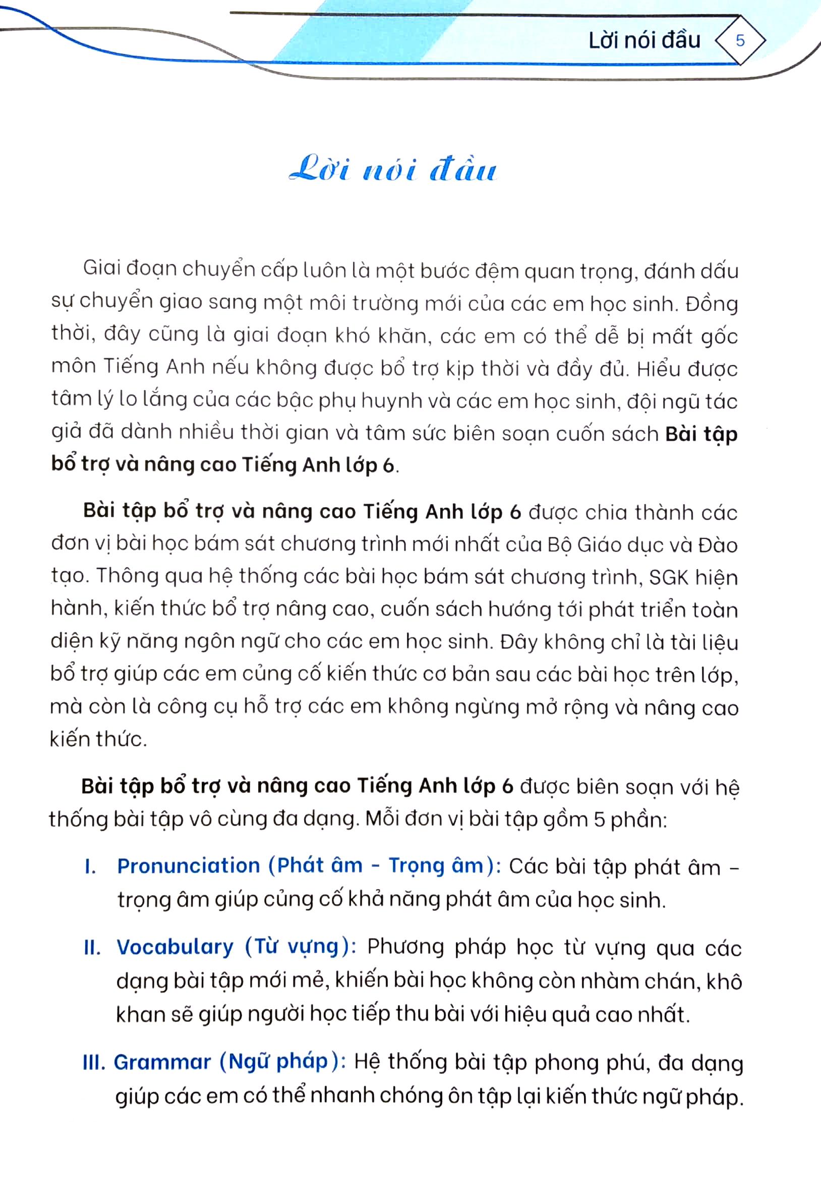 Mua tại TiktokBài Tập Bổ Trợ Và Nâng Cao Tiếng Anh Lớp 6 - Tập 1 (Có Đáp Án) Cuốn sách được chia thành các đơn vị bài học bám sát chương trình mới nhất của Bộ giáo dục và Đào tạo . Đây không chỉ là tfai liệu bổ trợ giúp các em củng cố kiến thức cơ bản sau các bài học trên lớp , mà còn là công cụ hỗ trợ các em không ngừng mở rộng và nâng cao kiến thức. át âm - trọng âm 2.Từ vựng ữ pháp 4.Kỹ năng đọc 5.Kỹ năng viết