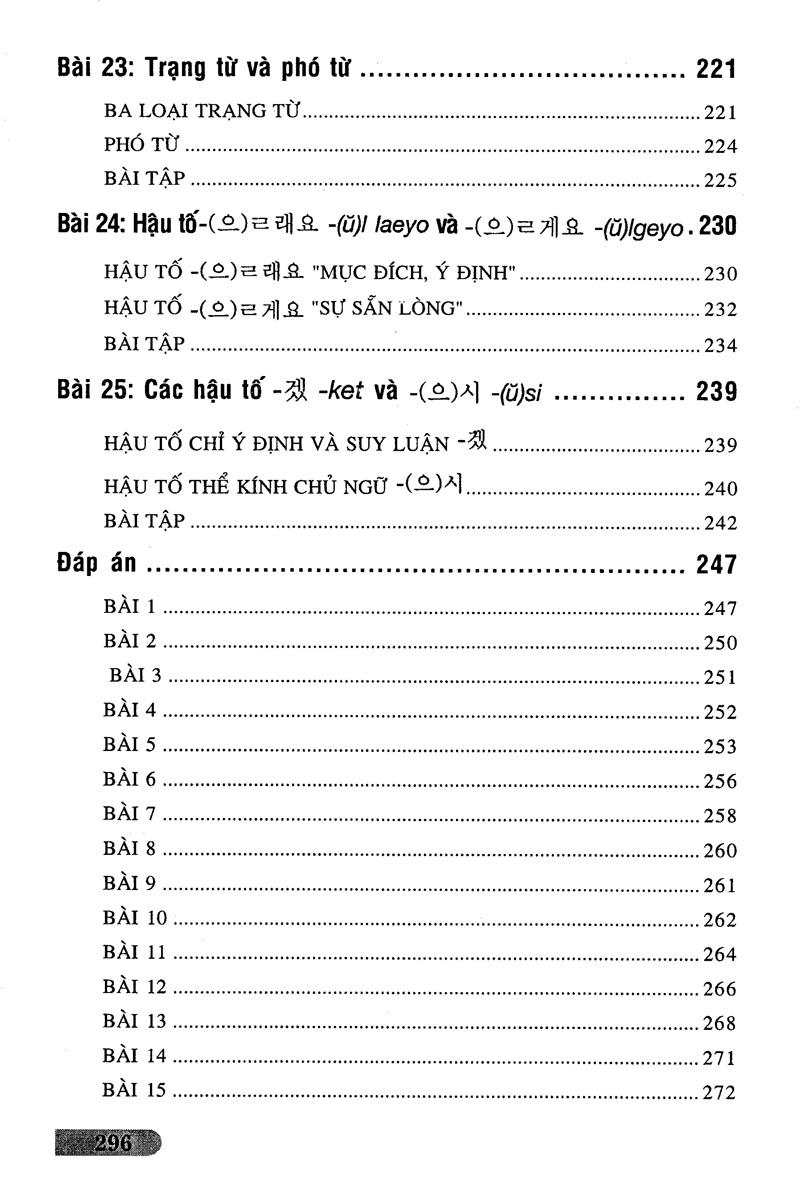 Quyển Bài Tập Ngữ Pháp Tiếng Hàn (Trình Độ Căn Bản) này gôm có 25 bài, hướng dẫn một cách có trình tự và lôgíc các điểm ngữ pháp tiếng Hàn theo từng loại cụ thể như danh từ, đại từ, tiểu từ, số từ, động từ, tính từ,... Các bài tập ở cuối mỗi bài được bố cục chủ yếu để người học tự luyện tập và nắm vững các điểm ngữ pháp.