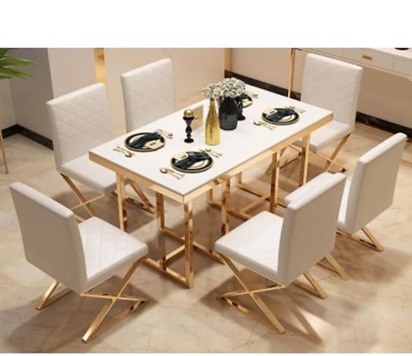 Bộ bàn ăn mặt đá nhập khẩu chân mạ vàng PVD ghế Queen - noithatgiakho.com