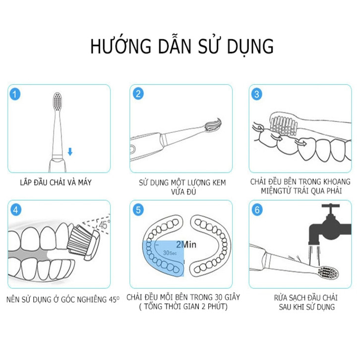 - Hẹn giờ tự động 2 phút. Hệ điều khiển thông minh rung báo hiệu sau mỗi 30 giây báo người dùng chuyển cung hàm đánh răng. Đảm bảo thời gian 2 phút đánh răng khoa học