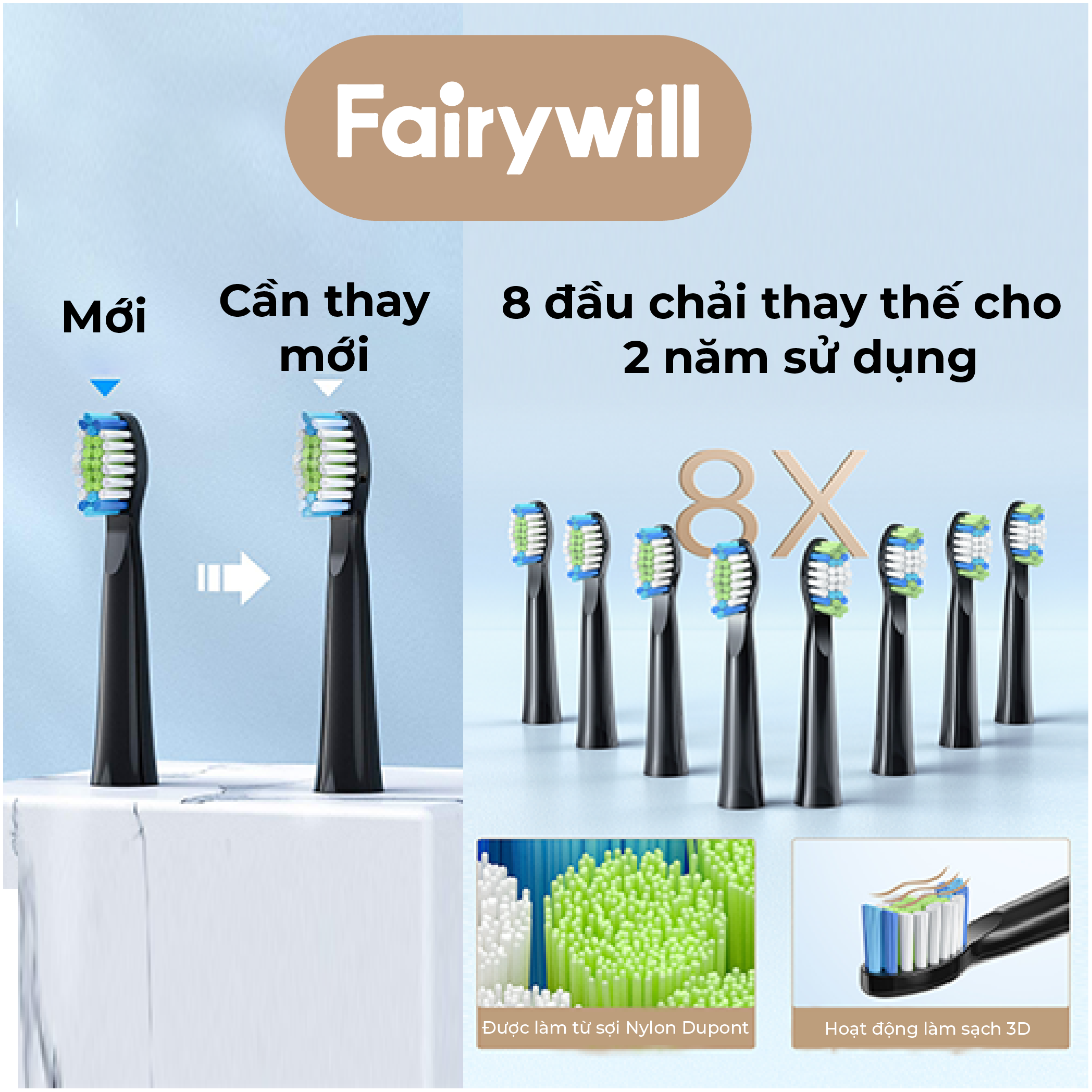 - Với 8 đầu bàn chải đi kèm, bộ kit Fairywill E11 đủ sử dụng tối thiểu 2 năm