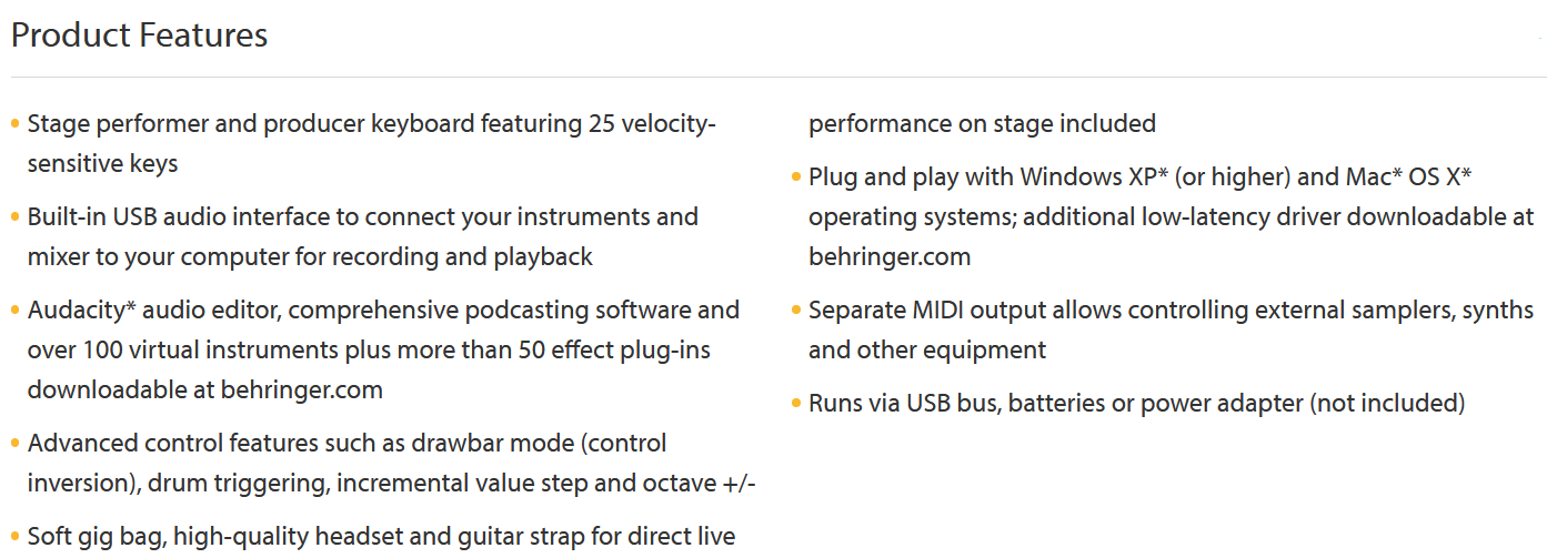 Bàn phím điều khiển USB / MIDI 25 phím siêu mỏng với giao diện âm thanh     Bàn phím của nghệ sĩ biểu diễn sân khấu và nhà sản xuất có 25 phím cực nhạy Giao diện âm thanh USB tích hợp để kết nối nhạc cụ và Mixer của bạn với máy tính để ghi và phát lại Trình chỉnh sửa âm thanh Audacity , phần mềm podcasting toàn diện và hơn 100 công cụ ảo cộng với hơn 50 trình cắm thêm hiệu ứng có thể tải xuống tại Các tính năng điều khiển nâng cao như chế độ thanh kéo (đảo ngược điều khiển), kích hoạt trống, bước giá trị gia tăng và quãng tám +/- Bao gồm túi biểu diễn mềm, tai nghe chất lượng cao và dây đeo guitar để biểu diễn trực tiếp trên sân khấu Cắm và chạy với hệ điều hành Windows XP (hoặc cao hơn) và Mac OS X ; trình điều khiển có độ trễ thấp bổ sung có thể tải xuống tại Đầu ra MIDI riêng biệt cho phép điều khiển bộ lấy mẫu bên ngoài, bộ tổng hợp và các thiết bị khác Chạy qua bus USB, pin hoặc bộ đổi nguồn (không bao gồm)