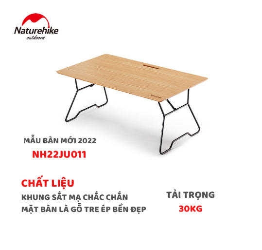 MÔ TẢ SẢN PHẨM Thông tin sản phẩm: - Thương hiệu: NatureHike - Mã sản phẩm: NH22JU012 - Chất liệu: - Mặt bàn: Gỗ tre - Khung bàn: hợp kim nhôm - Túi vải: Vải