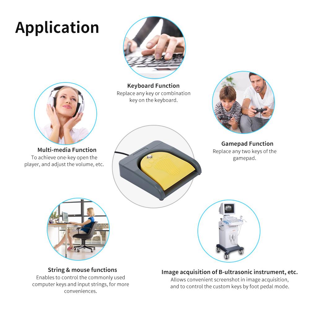 The USB foot switch is a custom function keyboard for one key or a few key, which can customize any key, key combination, hotkeys or shortcuts keys, and can be applied to medical devices, computers