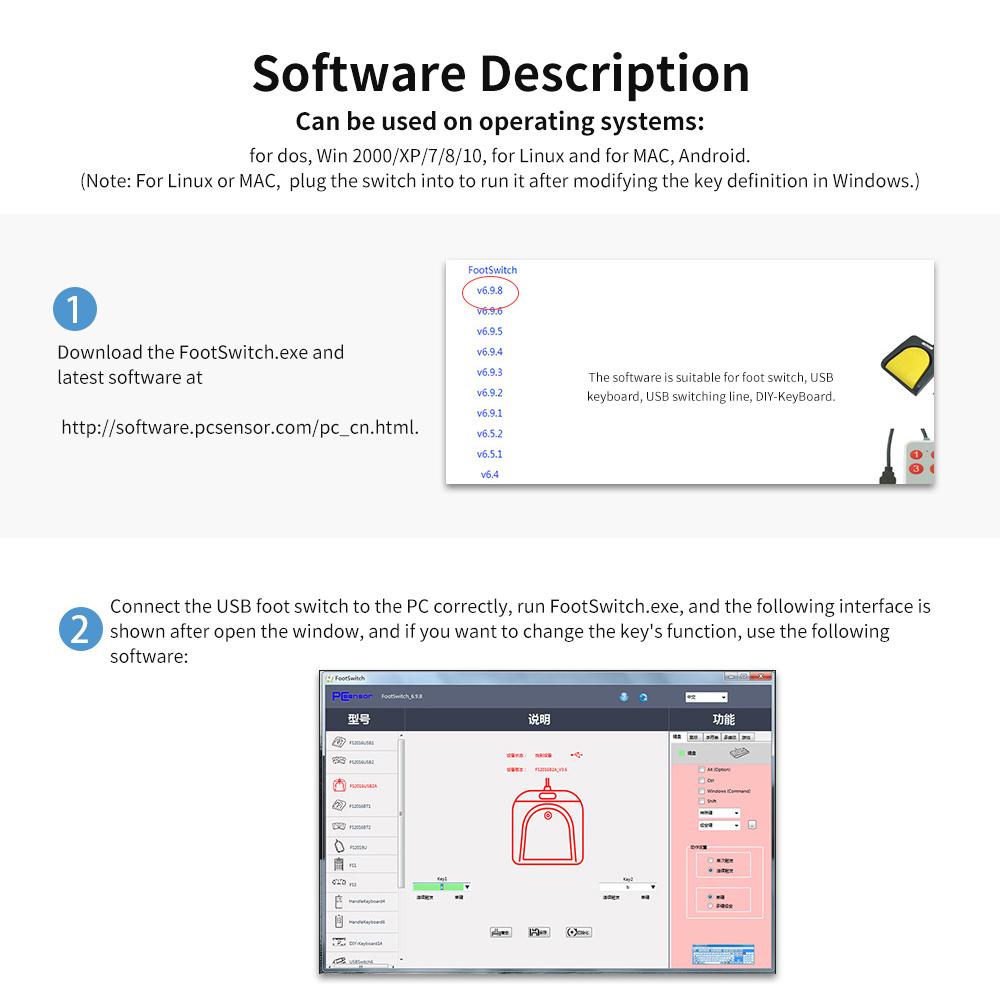 The USB foot switch is a custom function keyboard for one key or a few key, which can customize any key, key combination, hotkeys or shortcuts keys, and can be applied to medical devices, computers office, etc.