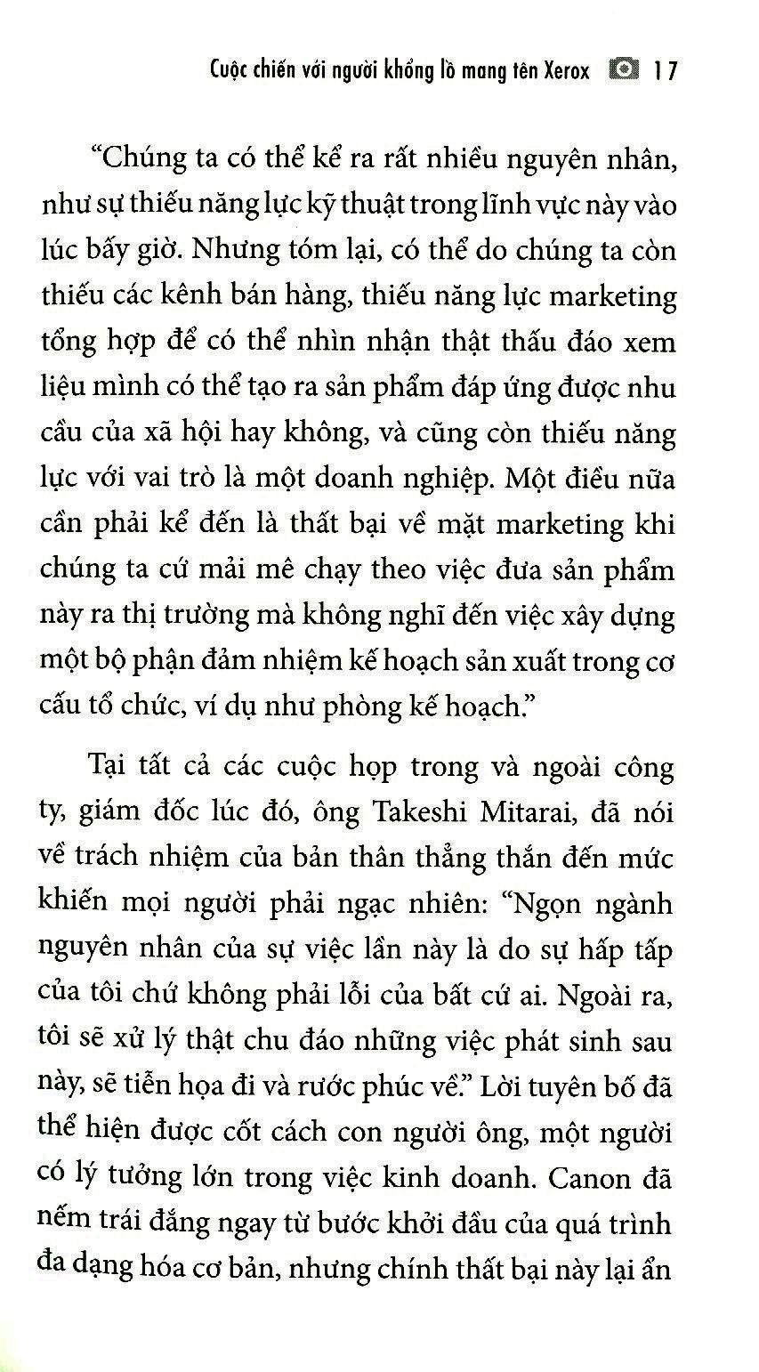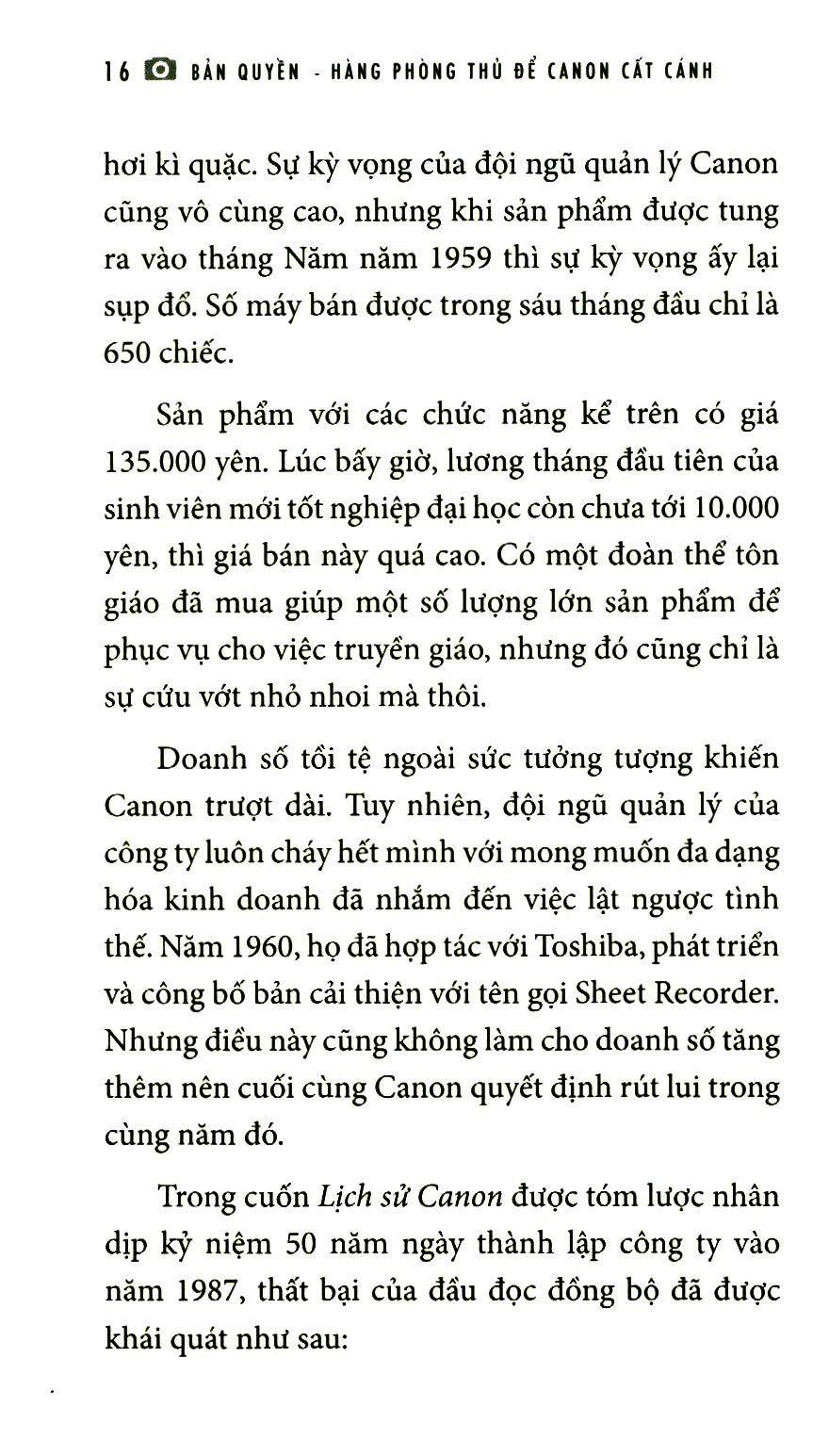 Trích đoạn sách: Canon mang tham vọng về việc đa dạng hóa Khi Marushima mới vào làm, Công ty Máy ảnh Canon (hiện là Canon) đang trong giai đoạn chuyển mình nhằm thoát khỏi hình ảnh một công ty chuyên sản xuất máy ảnh cao cấp kể từ lúc thành lập. Cụ thể, công ty sẽ tiến hành khai thác thị trường máy ảnh trung cấp dễ sử dụng, hướng đến kỷ nguyên đại chúng hóa – thời đại này nhất định sẽ đến và công cuộc khai thác sẽ diễn ra tại xưởng sản xuất máy ảnh – được đánh giá là nơi sản xuất máy móc cao cấp. Thêm vào đó, công ty sẽ vận dụng những kỹ thuật điện tử, công nghệ chính xác và công nghệ quang học đã tích lũy được và lên kế hoạch cho việc đa dạng hóa các dòng sản phẩm liên quan đến máy ảnh như ống kính zoom chuyên dụng để quay các chương trình truyền hình hay máy quay phim bản Hơn nữa, công ty cũng hướng tới đa dạng hóa toàn bộ công việc kinh doanh, mở rộng sang các mảng khác như máy móc dùng trong y khoa hay trong gia đình và văn phòng. Đầu đọc đồng bộ ra mắt năm 1959 là điểm khởi đầu cho sự đa dạng hóa này.Đầu đọc đồng bộ là sáng chế của Giáo sư Yasushi Hoshino thuộc trường Đại học Công nghiệp Tokyo. Ở mặt sau của một tờ giấy có in hình ảnh và chữ, ta quét lên đó vật liệu từ tính theo chiều rộng nhất định, khi đặt lên bàn xoay đã được gắn ba đầu từ, nó có thể ghi âm và phát lại âm thanh. Thiết bị này cho phép người dùng vừa nhìn thấy chữ và hình ảnh vừa có thể nghe được âm thanh, vì vậy nó được đặt tên là đầu đọc đồng bộ (synchro reader). Ngày nay, khi kỹ thuật ghi âm đã tiến bộ rất nhiều, có lẽ bạn không nghĩ rằng thiết bị này là điều gì ghê gớm, nhưng vào thời đó, nó được coi là kỹ thuật trong mơ. Đội ngũ quản lý của Canon lúc bấy giờ đã nhanh chóng nắm bắt kỹ thuật này. Ông Hiroshi Suzukawa – Giám đốc, Trưởng phòng Kỹ thuật thời đó – là người đã nhiệt tình thúc đẩy kỹ thuật này. Ông tiến hành tuyển dụng những kỹ sư điện mà công ty đang thiếu, tổ chức phát triển mang tính tập trung và chỉ trong vòng hai năm, ông đã giúp Canon gặt hái được thành công trong việc biến kỹ thuật này thành sản phẩm. Đầu đọc đồng bộ trở thành tâm điểm chú ý của giới truyền thông trước cả khi được bày bán, đến mức nhìn từ hiện tại, ta sẽ có cảm giác điều này hơi kì quặc. Sự kỳ vọng của đội ngũ quản lý Canon cũng vô cùng cao, nhưng khi sản phẩm được tung ra vào tháng Năm năm 1959 thì sự kỳ vọng ấy lại sụp đổ. Số máy bán được trong sáu tháng đầu chỉ là 650 chiếc. Sản phẩm với các chức năng kể trên có giá 135.000 yên. Lúc bấy giờ, lương tháng đầu tiên của sinh viên mới tốt nghiệp đại học còn chưa tới 10.000 yên, thì giá bán này quá cao. Có một đoàn thể tôn giáo đã mua giúp một số lượng lớn sản phẩm để phục vụ cho việc truyền giáo, nhưng đó cũng chỉ là sự cứu vớt nhỏ nhoi mà thôi. Doanh số tồi tệ ngoài sức tưởng tượng khiến Canon trượt dài. Tuy nhiên, đội ngũ quản lý của công ty luôn cháy hết mình với mong muốn đa dạng hóa kinh doanh đã nhắm đến việc lật ngược tình thế. Năm 1960, họ đã hợp tác với Toshiba, phát triển và công bố bản cải thiện với tên gọi Sheet Recorder. Nhưng điều này cũng không làm cho doanh số tăng thêm nên cuối cùng Canon quyết định rút lui trong cùng năm đó. Trong cuốn Lịch sử Canon được tóm lược nhân dịp kỷ niệm 50 năm ngày thành lập công ty vào năm 1987, thất bại của đầu đọc đồng bộ đã được khái quát như sau: “Chúng ta có thể kể ra rất nhiều nguyên nhân, như sự thiếu năng lực kỹ thuật trong lĩnh vực này vào lúc bấy giờ. Nhưng tóm lại, có thể do chúng ta còn thiếu các kênh bán hàng, thiếu năng lực marketing tổng hợp để có thể nhìn nhận thật thấu đáo xem liệu mình có thể tạo ra sản phẩm đáp ứng được nhu cầu của xã hội hay không, và cũng còn thiếu năng lực với vai trò là một doanh nghiệp. Một điều nữa cần phải kể đến là thất bại về mặt marketing khi chúng ta cứ mải mê chạy theo việc đưa sản phẩm này ra thị trường mà không nghĩ đến việc xây dựng một bộ phận đảm nhiệm kế hoạch sản xuất trong cơ cấu tổ chức, ví dụ như phòng kế hoạch.” Tại tất cả các cuộc họp trong và ngoài công ty, giám đốc lúc đó, ông Takeshi Mitarai, đã nói về trách nhiệm của bản thân thẳng thắn đến mức khiến mọi người phải ngạc nhiên: “Ngọn ngành nguyên nhân của sự việc lần này là do sự hấp tấp của tôi chứ không phải lỗi của bất cứ ai. Ngoài ra, tôi sẽ xử lý thật chu đáo những việc phát sinh sau này, sẽ tiễn họa đi và rước phúc về.” Lời tuyên bố đã thể hiện được cốt cách con người ông, một người có lý tưởng lớn trong việc kinh doanh. Canon đã nếm trái đắng ngay từ bước khởi đầu của quá trình đa dạng hóa cơ bản, nhưng chính thất bại này lại ẩn giấu tiềm năng phát triển về sa