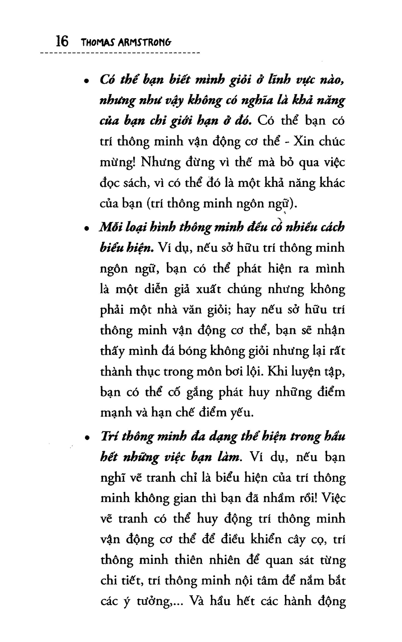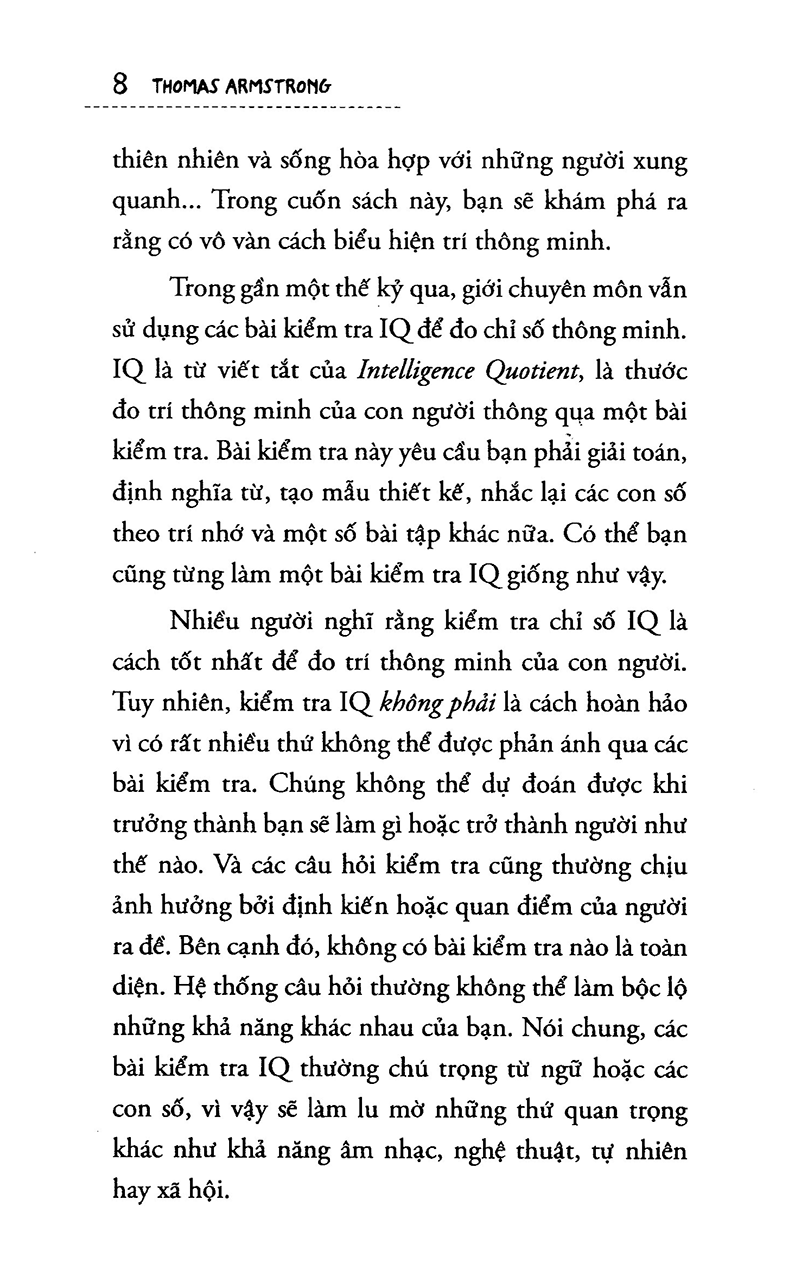 Mua tại TiktokBạn Thông Minh Hơn Bạn Nghĩ Bạn có nghĩ mình thông minh không? Và trí thông minh là gì? Nhiều người tin rằng thông minh là phải đạt điểm tốt hoặc giành thứ hạng cao ở trường học. Hoặc thông minh là làm được những việc như: Đọc thật tốt Giải toán nhanh Học thuộc lòng giỏi Những điều này có thể khiến bạn ngạc nhiên bởi trí thông minh có thể biểu hiện theo nhiều cách thức khác nhau – trong nghệ thuật, âm nhạc, thể thao, trong cách cảm nhận, sự hiểu biết về thiên nhiên và sống hòa hợp với những người xung Bạn thông minh hơn bạn nghĩ sẽ giúp bạn khám phá ra rằng có vô vàn cách biểu hiện trí thông minh. Trong gần một thế kỷ qua, giới chuyên môn vẫn sử dụng các bài kiểm tra IQ để đo chỉ số thông minh. IQ là từ viết tắt của Intelligence Quotient, là thước đo trí thông minh của con người thông qua một bài kiểm tra. Bài kiểm tra này yêu cầu bạn phải giải toán, định nghĩa từ, tạo mẫu thiết kế, nhắc lại các con số theo trí nhớ và một số bài tập khác nữa. Có thể bạn cũng từng làm một bài kiểm tra IQ giống như vậy. Nhiều người nghĩ rằng kiểm tra chỉ số IQ là cách tốt nhất để đo trí thông minh của con người. Tuy nhiên, kiểm tra IQ không phải là cách hoàn hảo vì có rất nhiều thứ không thể phản ánh qua các bài kiểm tra. Chúng không thể dự đoán được khi trưởng thành bạn sẽ làm gì hoặc trở thành người như thế nào. Và các câu hỏi kiểm tra cũng thường chịu ảnh hưởng bởi định kiến hoặc quan điểm của người ra đề. Bên cạnh đó, không có bài kiểm tra nào là toàn diện. Hệ thống câu hỏi thường không thể làm bộc lộ những khả năng khác nhau của bạn. Nói chung, các bài kiểm tra IQ thường chú trọng từ ngữ hoặc các con số, vì vậy sẽ làm xao lãng những thứ quan trọng khác như khả năng âm nhạc, nghệ thuật, tự nhiên hay xã hội. Thời gian gần đây, nhiều nhà nghiên cứu nghi ngờ quan điểm cho rằng kiểm tra IQ là thước đo trí thông minh tốt nhất. Một trong số đó là nhà tâm lý học, Tiến sỹ Howard Gardner thuộc Đại học Harvard. Những công trình nghiên cứu của ông đã đưa ra một cái nhìn hoàn toàn mới về vấn đề “Thế nào là thông minh?”