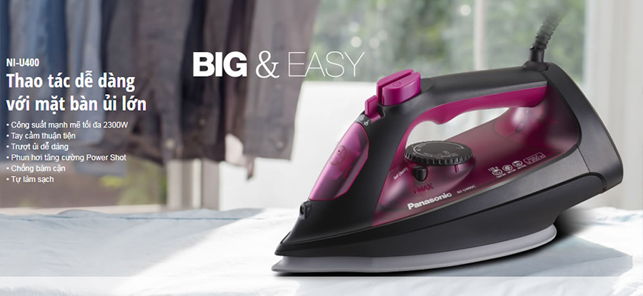 Ngoài ra, bản ủi Panasonic thích hợp với mọi loại vải, có vòng chỉnh nhiệt giúp lựa chọn được mức nhiệt độ phù hợp cho từng loại vải, đèn báo sẽ tự tắt khi đạt mức nhiệt cần thiết, bảo vệ quần áo không bị cháy xém do gặp phải nhiệt độ quá cao.