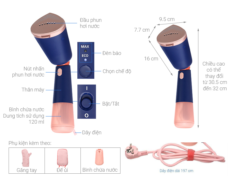 - Chức năng: +Phun hơi liên tục +Phun hơi +Ủi hơi nước +Phun tia +Phun hơi thẳng đứng