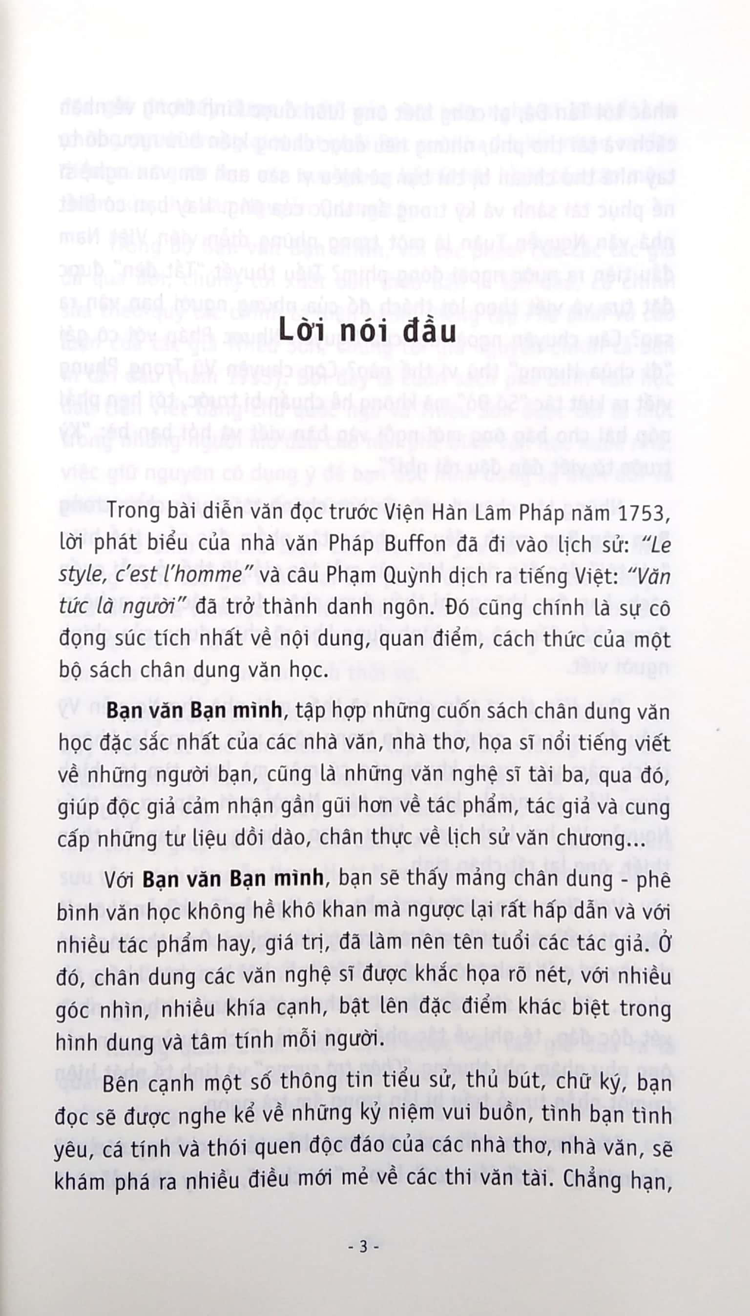 Bộ Bạn Văn Bạn Mình tuyển chọn những cuốn chân dung văn học đặc sắc. Từ cuốn sách phê bình văn học đầu tiên viết bằng chữ Quốc ngữ, tới những cuốn sách có tư