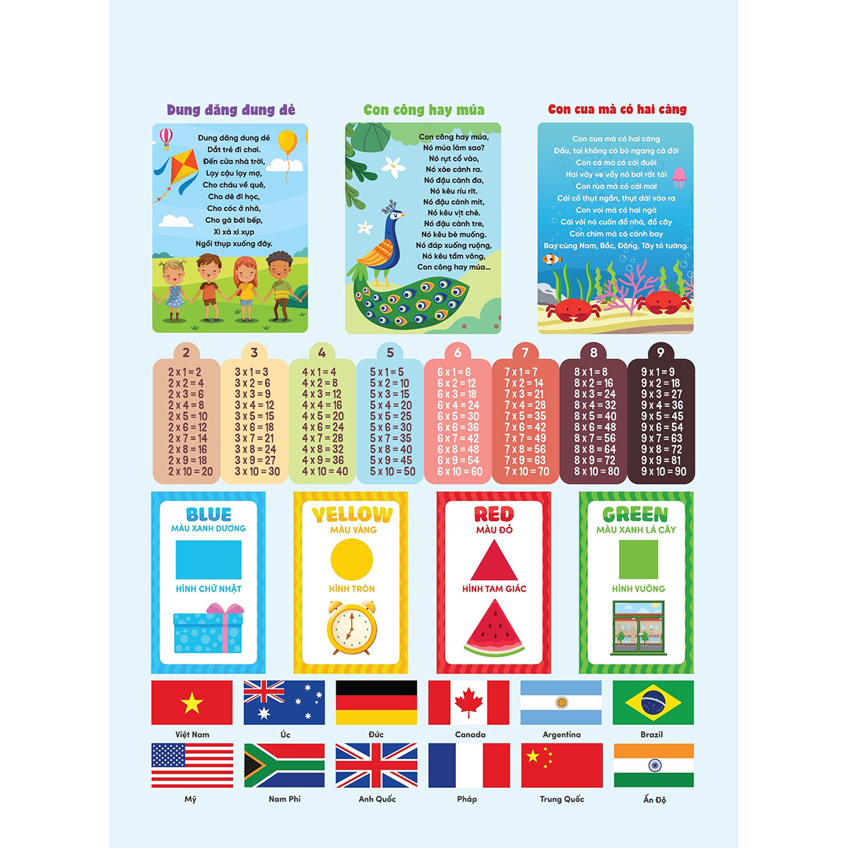• Bảng số đếm: bao gồm 28 chữ số từ 1 – 20 và các chữ số tròn chục trong phạm vi 100. Bên cạnh mỗi con số là một hoặc nhiều hình ảnh minh họa khác nhau miêu tả ý nghĩa của con số tương ứng.