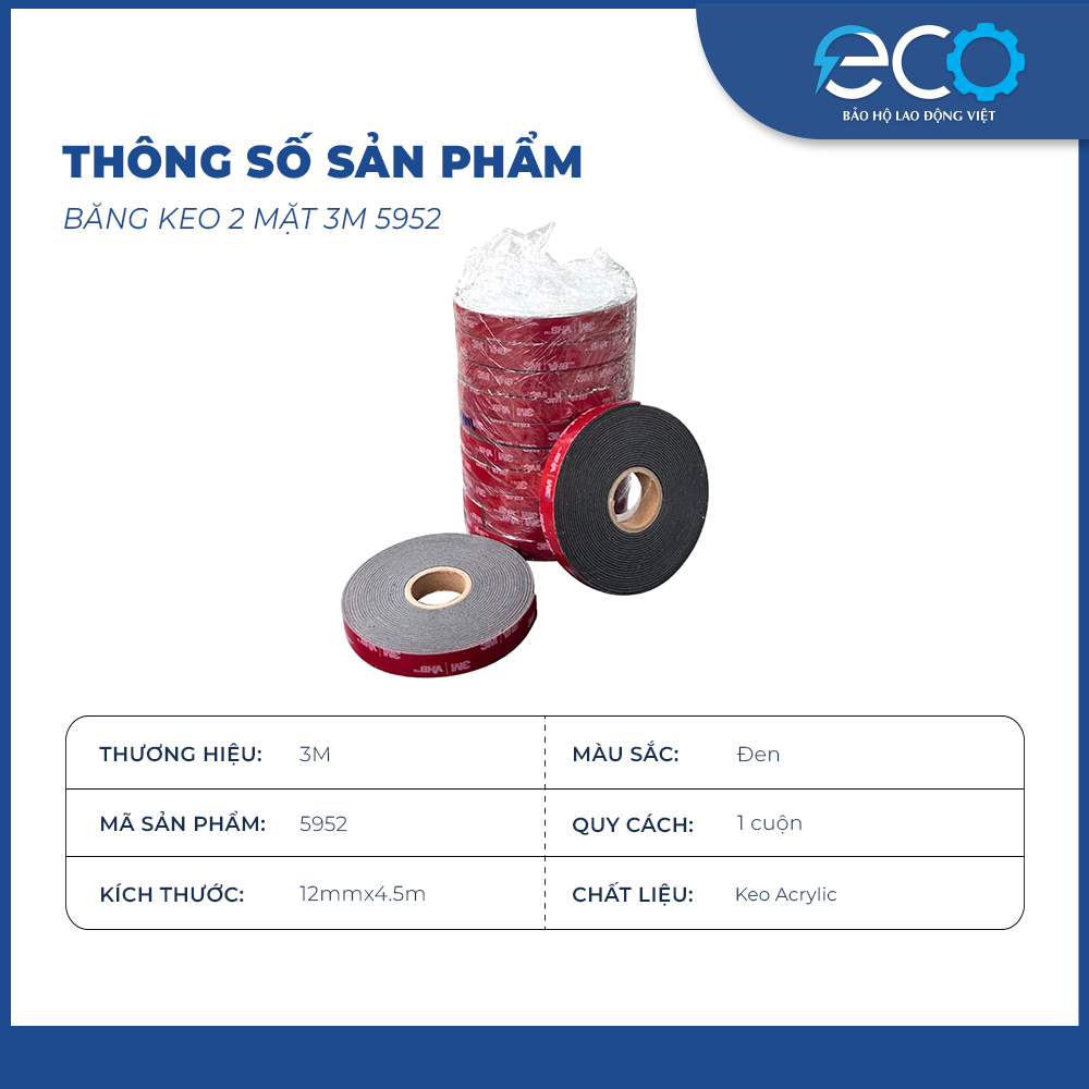 - Dán đồ dùng trang trí bằng inox , nhôm , sắt , kim loại ,trong gia đình và trên các bề mặt khác vv.... – Băng dính cường lực 3M VHB 5952 có khả năng chịu lực rất tốt với tỉ trọng: 590kg/m3 (ở nhiệt độ 22 độ C trong 7 ngày và 250kg/m3 ở 121C) – Lực bám dính trên thép ở phương 900: 39N/cm – Khả năng chống nứt, chống UV, và chống nước, chống va đập, mài mòn – Có thể sử dụng cho các ứng dụng trong nhà hoặc ngoài trời. – Không bị chết keo, không để lại keo sau khi lột bỏ. ️ Đặc điểm nổi bật của băng keo 3M 5952 Siêu dính, siêu cường lực: Khả năng bám dính mạnh mẽ trên nhiều bề mặt khác nhau như kim loại, kính, nhựa, gỗ sơn, composite,… Độ bền cao: Chịu lực tốt, chống chịu nhiệt độ, độ ẩm, hóa chất, tia UV và điều kiện thời tiết khắc nghiệt. Thay thế đinh, vít, hàn: Giúp lắp ráp nhanh chóng, không cần khoan đục, bảo vệ bề mặt vật liệu. Lõi xốp đen đàn hồi: Độ dày khoảng 1.1mm, giúp hấp thụ sốc và rung động hiệu quả. Dễ dàng sử dụng: Chỉ cần bóc lớp bảo vệ và dán trực tiếp mà không cần gia nhiệt hay dụng cụ phức tạp. ️ Ứng dụng của băng keo 3M 5952 Ngành công nghiệp & sản xuất: Lắp ráp ô tô, xe máy, điện tử, nội thất, bảng hiệu quảng cáo,… Dán kim loại, nhựa, kính, gỗ sơn: Gắn kết vật liệu bền chặt mà không cần hàn hay bắt vít. Dán bảng hiệu, logo, chữ nổi: Giữ chắc chắn trên tường, kính, alu, không bong tróc. Sửa chữa, gia cố đồ gia dụng: Dán móc treo, giá đỡ, phụ kiện trang trí mà không làm hư hại bề mặt. Với độ bám dính cực cao, 3M 5952 là giải pháp kết dính lý tưởng, vừa chắc chắn vừa đảm bảo tính thẩm mỹ