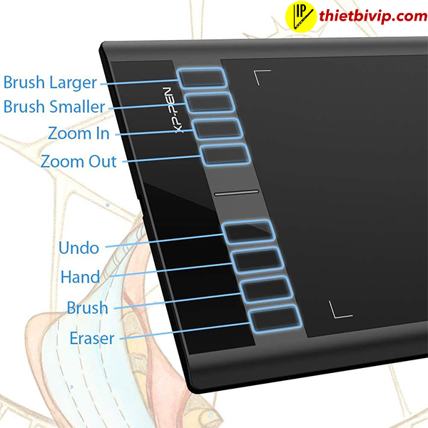 XP-Pen Star03 với 8 nút bấm có thể thiết lập mọi thao tác phím tắt giúp tối thiểu nhu cầu dùng bàn phím ngoài, hỗ trợ các tính năng chỉnh sửa bạn hay xài và các tổ hợp phím khác như Ctrl+S (Save), Ctrl+X (Undo), từ đầu, XP-Pen Star 03 đã được thiết lập các tính năng mặc định: Brush enhance/weaken, zoom-in/out, Undo, hand tool, brush tool, erase, tuy nhiên bạn có thể vào driver của máy để chỉnh lại. Hỗ trợ cả phím tắt như khi cần mở nhanh một chương trình hay website nào đó.