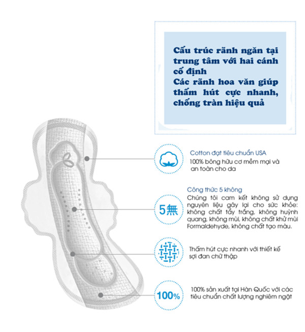 Thành phần Cotton 10%, nonwoven: 30%, polyethylene Film 13%, Sthylene butadiene 7%, high absorption sheet 40%.