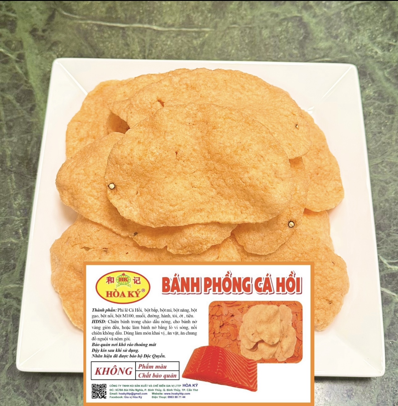 HDSD: Chiên bánh trong chảo dầu nóng, cho bánh nở vàng giòn đều, hoặc làm bánh nở bằng lò vi sóng, nồi chiên không dầu. Dùng làm món khai vị , ăn vặt, ăn chung đồ nguội và nộm gỏi .   Bảo quản nơi khô ráo thoáng mát- Đậy kín sau khi sử dụng.   Nhãn hiệu đã được đăng ký độc quyền .   BÁNH PHỒNG CÁ HỒI. Sản phẩm độc quyền Công Ty Hoà Ký sản xuất.   Cá Hồi là một loại cá có rất nhiều khoáng chất và dinh dưỡng, 100gr cá hồi chứa khoảng 200 calo, ít chất béo bão hòa, nhiều protein tốt và đây cũng là một trong những nguồn vitamin B12, Kali, sắt và vitamin D rất dồi dào.   Vitamin B12 trong cá hồi giữ cho các tế bào máu và thần kinh hoạt động tốt, giúp tạo DNA. Ngoài ra, cá hồi có chứa nhiều axit béo omega-3, đây là axit béo "thiết yếu"cho cơ thể, giúp giảm các tác nhân gây ra các bệnh về tim mạch (bao gồm đau tim và đột quỵ), ung thư, sa sút trí tuệ, bệnh Alzheimer giảm viêm khớp dạng thấp.   Nắm bắt được nhu cầu của Quý thực khách, nay Công Ty Hoà Ký đã sản xuất cho ra mắt sản phẩm: BÁNH PHỒNG CÁ HỒI, món nầy đang được độc quyền trên Thị trường Ẩm thực VIệt Nam.   Thành phẩm: Bánh phao, giòn, xốp vị ngọt tự nhiên, thơm ngon vị đặc trưng của cá Hồi.