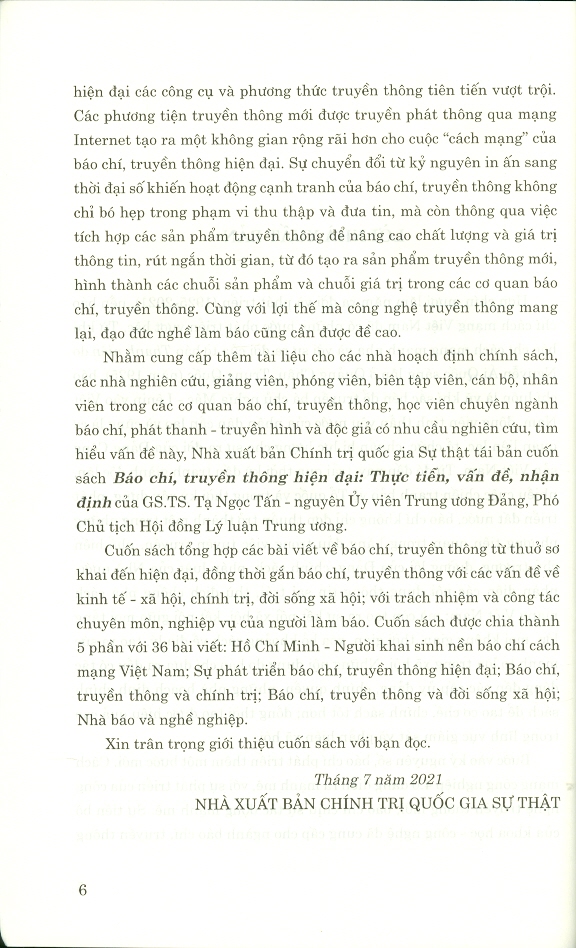 Mua tại TiktokCuốn sách tổng hợp các bài viết về báo chí, truyền thông từ thuở sơ khai đến hiện đại, đồng thời gắn báo chí, truyền thông với các vấn đề về kinh tế – xã hội, chính trị, đời sống xã hội; với trách nhiệm và công tác chuyên môn, nghiệp vụ của người làm báo. Cuốn sách được chia thành 5 phần với 36 bài viết: Hồ Chí Minh – Người khai sinh nền báo chí cách mạng Việt Nam; Sự phát triển báo chí, truyền thông hiện đại; Báo chí truyền thông và chính trị; Báo chí, truyền thông và đời sống xã hội; Nhà báo và nghề nghiệp.