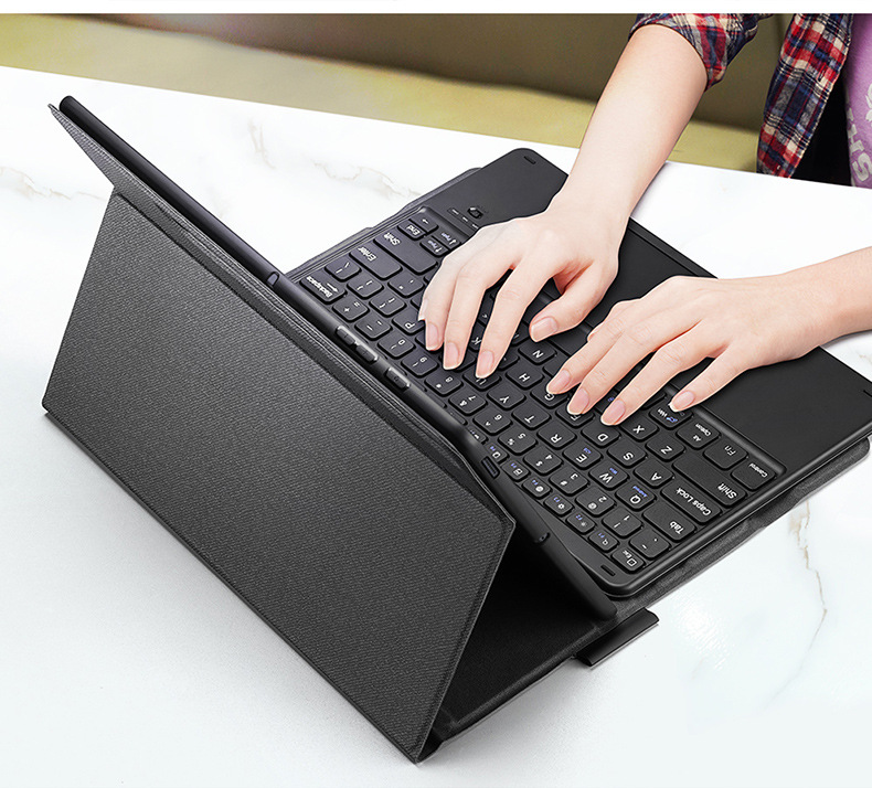 Bao da kèm bàn phím bluetooth có bàn di chuột chính hãng Dux Ducis giúp cho chiếc Galaxy Tab S9 Plus, S9 Fe Plus của các bạn trở thành một chiếc Laptop khá hoàn chỉnh. Kích thước nhỏ gọn mỏng đa năng thích hợp với giới văn phòng hoặc những bạn nào làm việc trên ipad mà phải di chuyển nhiều Keyboard thiết kê theo chuẩn QWERTY phổ thông dễ dàng sử dụng với các phím tắt tương thự như trên windows dải nút Funcion điểu khiển linh hoạt . Phần touch pad được tích hợp trên bàn phím như một chiếc Keyboard chính hãng của giúp giảm các thiết bị mang theo như chuột bluetooth cổng chuyển … Vỏ bọc ngoài bằng vải dạ dầy phủ kín phần máy và bàn phím , Ốp silicon ôm kín lưng máy bảo vệ tuyệt đối , chân đỡ máy mở ra gập vào gọn gàng lúc làm việc tạo độ nghiêng phu hợp cho người sử dụng thoải mái . Đóng mở thông minh tắt bật màn hình